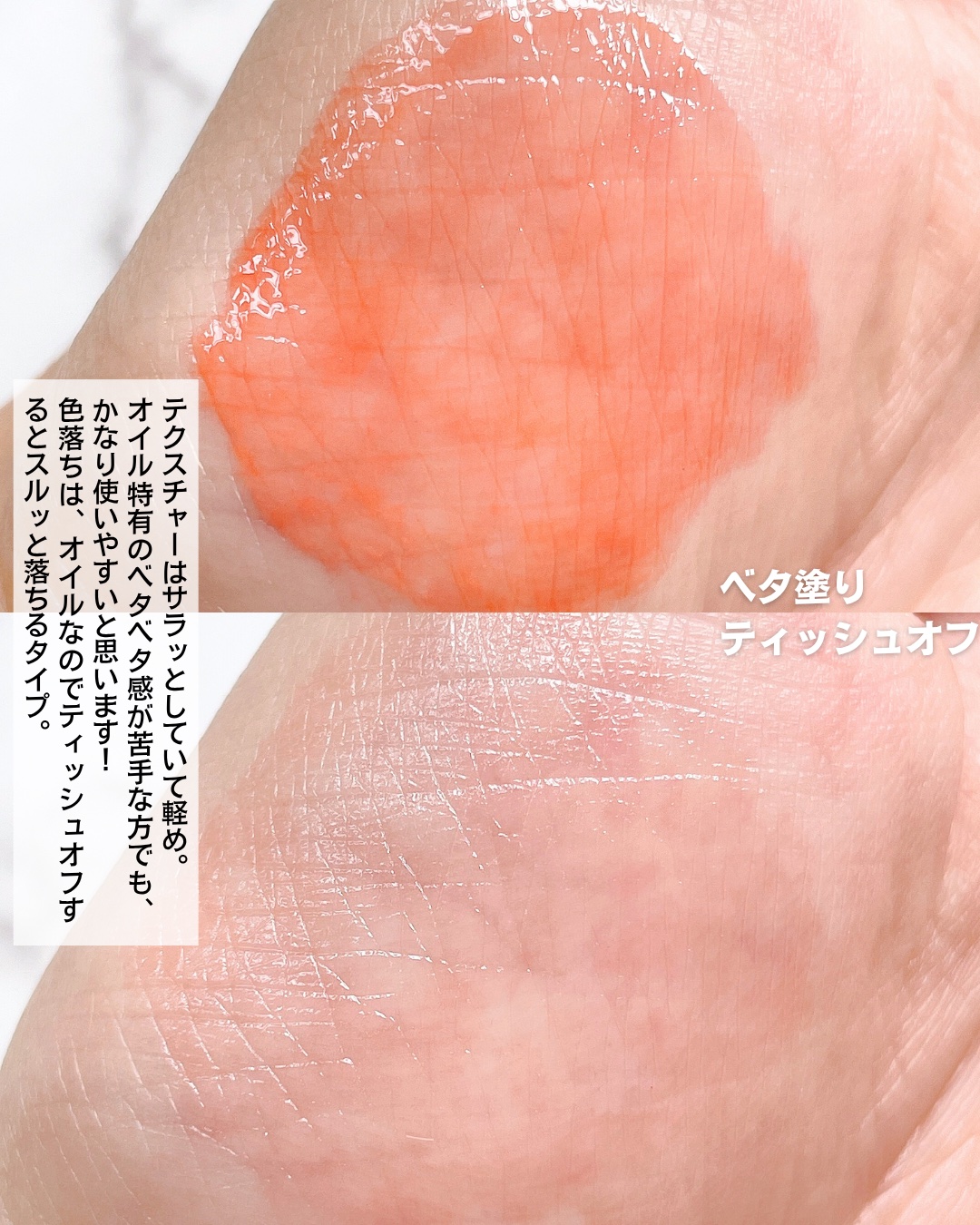 | 重すぎないほんのりとろっとしたテクスチャーのリップオイルです。 唇に乗せるとちゅるちゅるで可愛い! | 詳細を見る | ||