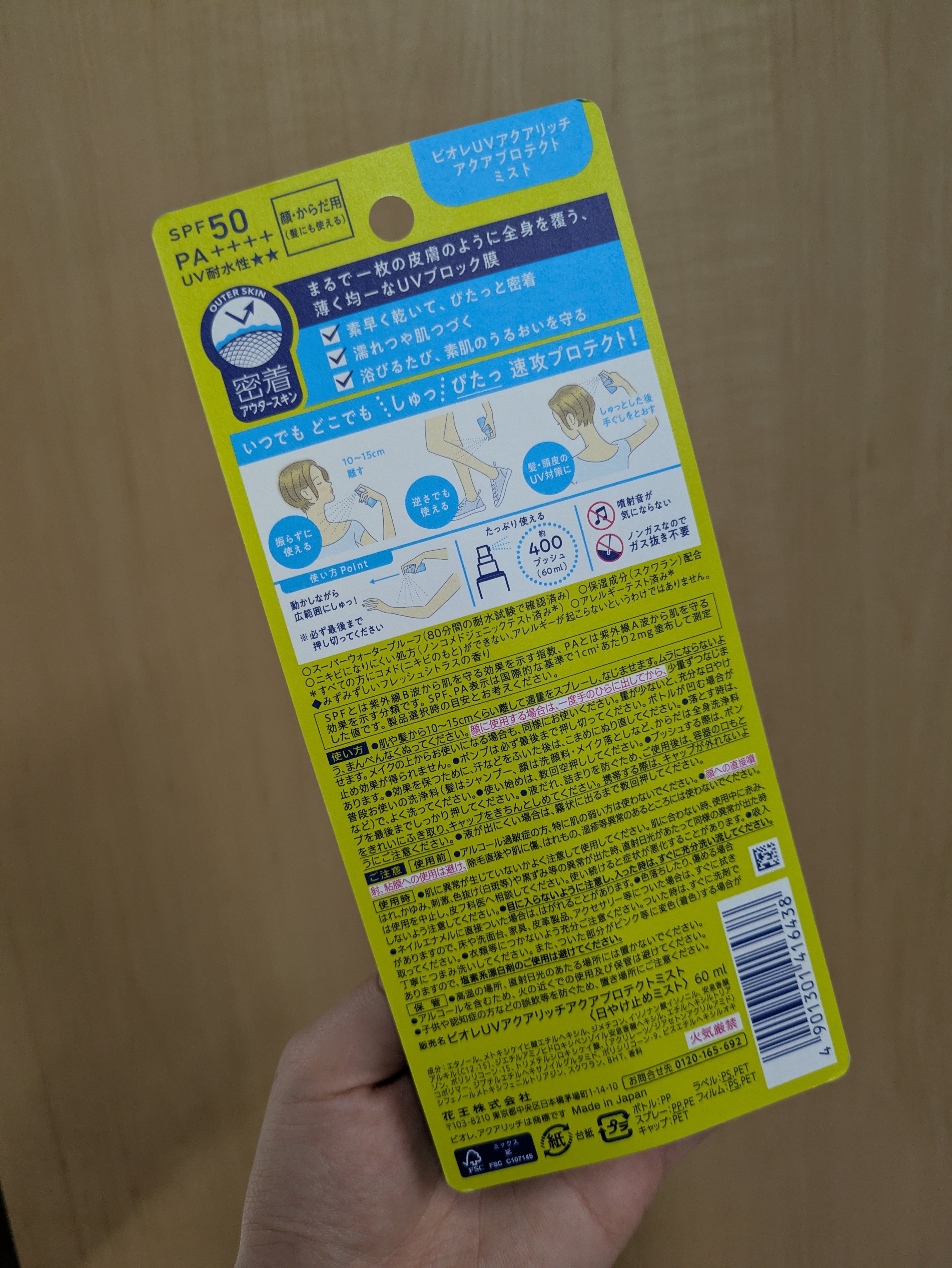 少し前にKaoさまの、Kaoコレモ!のキャンペーンでいただきました。ビオレビオレUVアクアリッチアクアプロテクトミスト顔、からだ、髪に使えます。霧のような細かいミストでした。体に使う場合は10~15cm離してまんべんなくかけます。顔に使う場合...