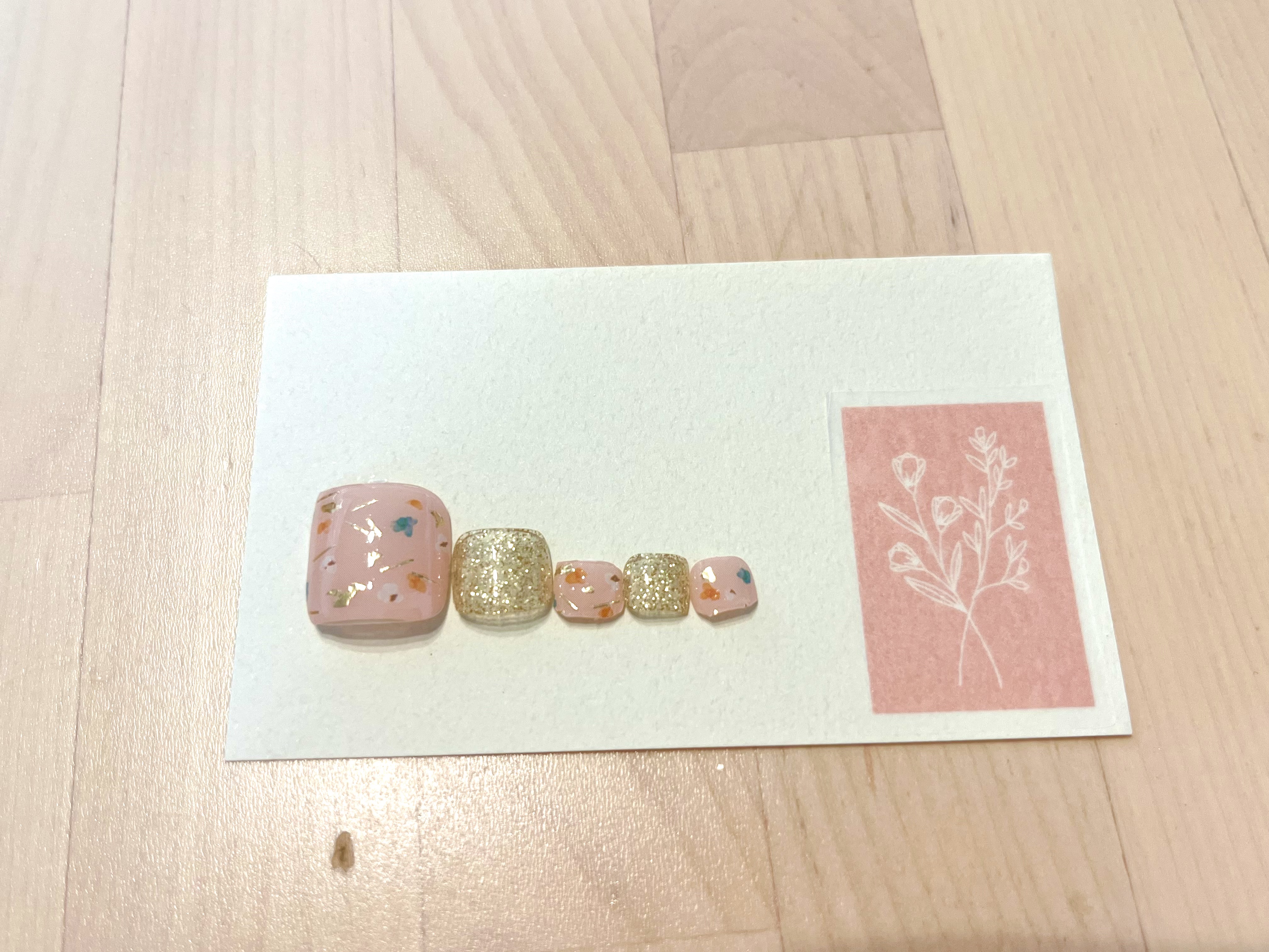 このピンクはオフィスネイル向けの可愛いカラーでした!1度塗りだと薄い感じがしたので2〜3度塗って少しづつ濃くしていきました。 花柄シールを使いたい時このミルキーホワイトは万能アイテムだなと思いながらよく使っています。 私のイチオシポイントは花柄の上に金箔を少量使用して少しゴージャス感を出しているところです。笑