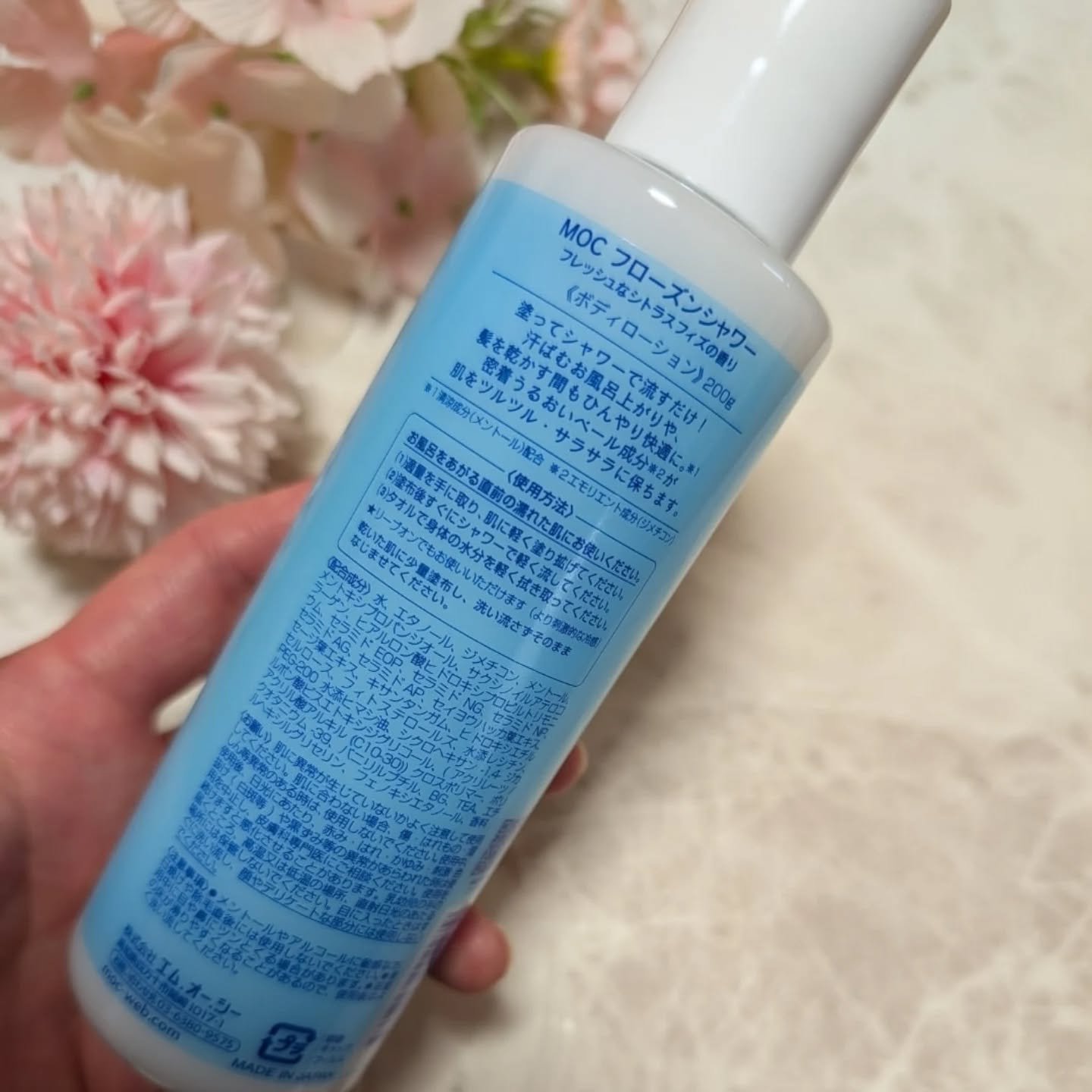 MOCフローズンシャワーシトラスフィズの香りお風呂上がりにひんやり気持ちがいいボディローション🧊白くてみずみずしいジェルのようなテクスチャーで お風呂を出る直前の濡れた肌にさっと塗ってシャワーで流すだけで使えます✨火照った肌を心地よくクールダ...