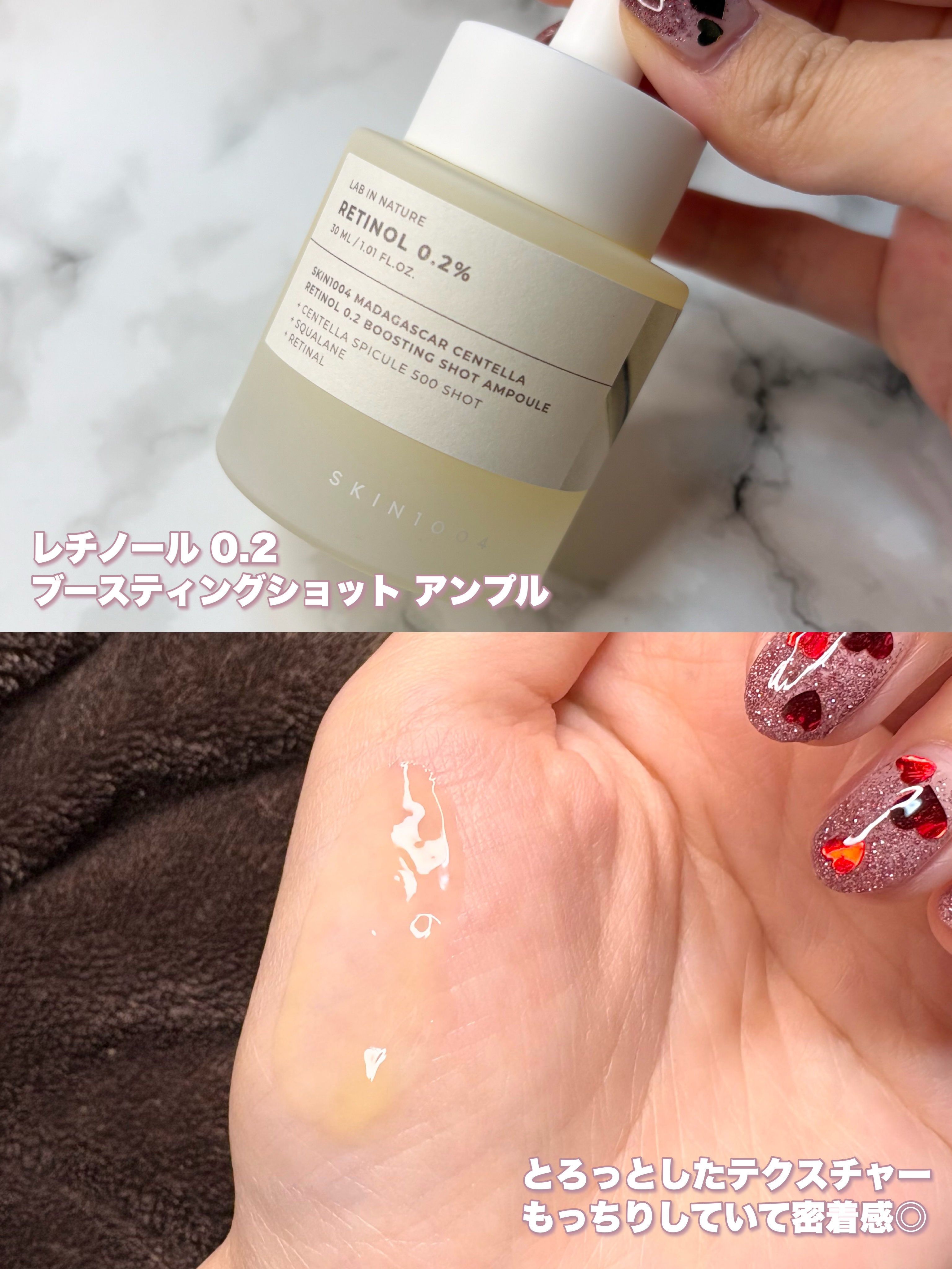 肌悩み毎に選んで使える美容液♡♡SKIN1004のブースティングショットアンプル3つをスウォッチ✨️SKIN1004レチノール0.2ブースティングショットアンプル肌のハリ・キメが気になる人に。トロミのある糸のように伸びるテクスチャーの美容液。...