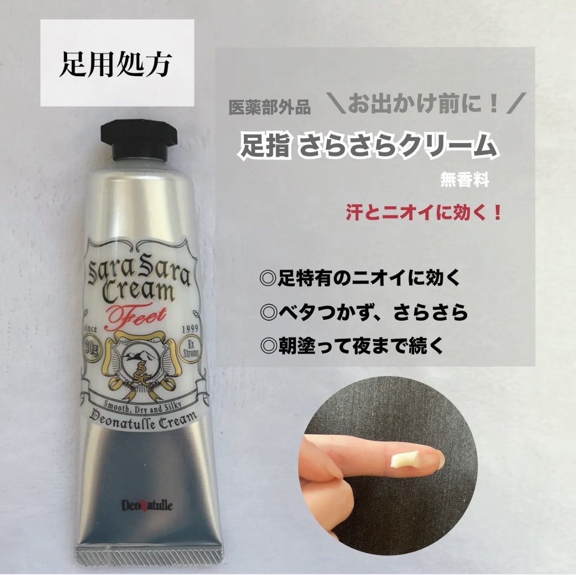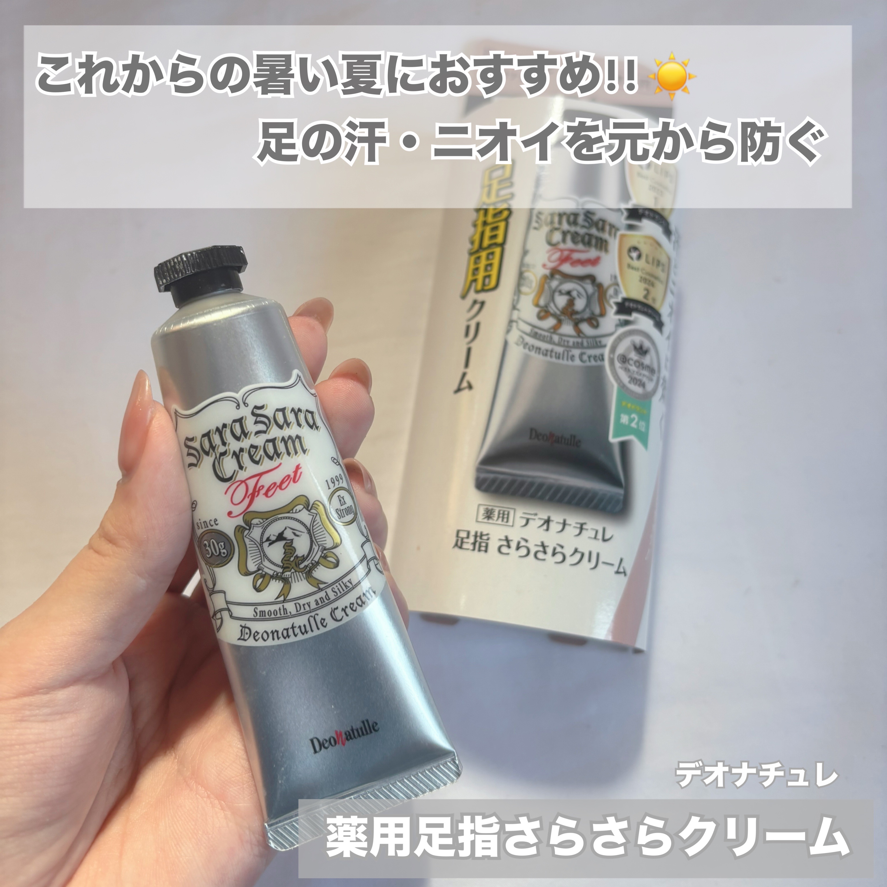 - \11年間ず~っと売上No.1*直ヌリ制汗デオドラントブランド/ 『防臭力のデオナチュレ』シリーズから、足特有のムレ・ニオイを防ぐ足用処方「薬用デオナチュレ足指さらさらクリーム」 ◆◆靴、脱ぐの⁈とドキッとすること、ありませんか?◆◆ 足は1日コップ約1杯分の汗をかき、ムレて、ニオイやすい だから、デオナチュレの足用でケア! ◆◆ユーザーから選ばれる理由◆◆ 1.天然アルム石に着目。有効成分「焼ミョウバン」を配合し、汗・ニオイを元から防ぐ! 足汗吸収さらさらパウダー**やティーツリーハーブ・ローズマリーエキス***を配合 2.ニオイの発生源に“直ヌリ”で、朝ぬって夜まで続いちゃう! 3.クリームなのに、ベタつかず・白残りしにくい ==注意== ●顔・粘膜を避け、除脱毛直後や肌に異常があるときは使用しないでください。●肌に異常が生じていないかよく注意してご使用ください。また、お肌に合わないとき、使用中に赤み、はれ、かゆみ、刺激、色抜け(白班等)や黒ずみ等の異常があらわれたときは、使用を中止し、皮フ科専門医などにご相談ください。●使用後はキャップをしっかり閉め、直射日光や高温多湿を避けて保管してください。●乳幼児の手の届かないところに置いてください。●床、靴、衣類などにつかないようご注意ください。 販売名:DN薬用フットクリームFc *インテージSRI+直ヌリ制汗剤市場(形状:ロールオン・スティック・クリーム・ジェル・パウダー) 2013年5月~2024年4月 デオナチュレシリーズ 累計販売金額 **基剤:無水ケイ酸 ***保湿成分