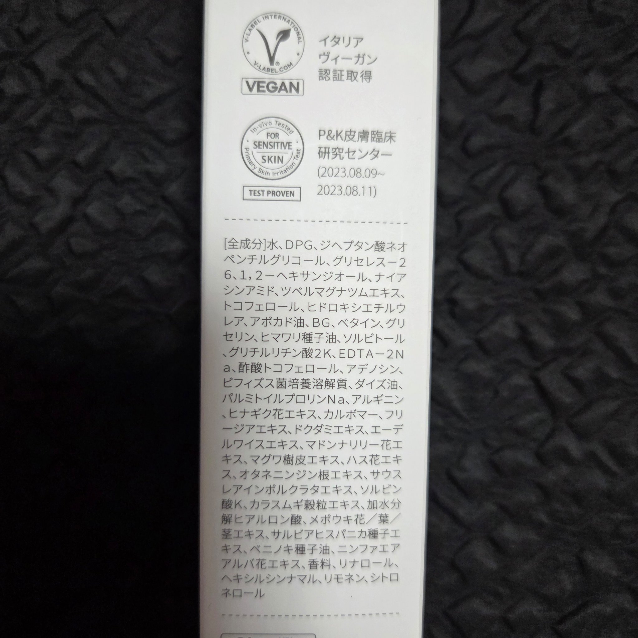 - <100ml> 水、BG、グリセリン、ソルビトール、加水分解ヒアルロン酸、カルボマー、香料、トコフェロール、グリチルリチン酸2K、アルギニン、ドクダミエキス、サルビアヒスパニカ種子エキス、DPG、ベタイン、ダイズ油、酢酸トコフェロール、1,2-ヘキサンジオール、ソルビン酸K、ヒマワリ種子油、EDTA-2Na、ヒナギク花エキス、ナイアシンアミド、リモネン、リナロール、シトロネロール、アデノシン、グリセレス-26、ヒドロキシエチルウレア、エーデルワイスエキス、ビフィズス菌培養溶解質、パルミトイルプロリンNa、ニンファエアアルバ花エキス、ジヘプタン酸ネオペンチルグリコール、ハス花エキス、カラスムギエキス、フリージアエキス、メボウキ花/葉/茎エキス、サウスレアインボルクラタエキス、マグワ樹皮エキス、マドンナリリー花エキス、ヘキシルシンナマル、ベニノキ種子油、アボカドオイル、ツベルマグナツムエキス(1、740ppm)、サンシチニンジン根エキス