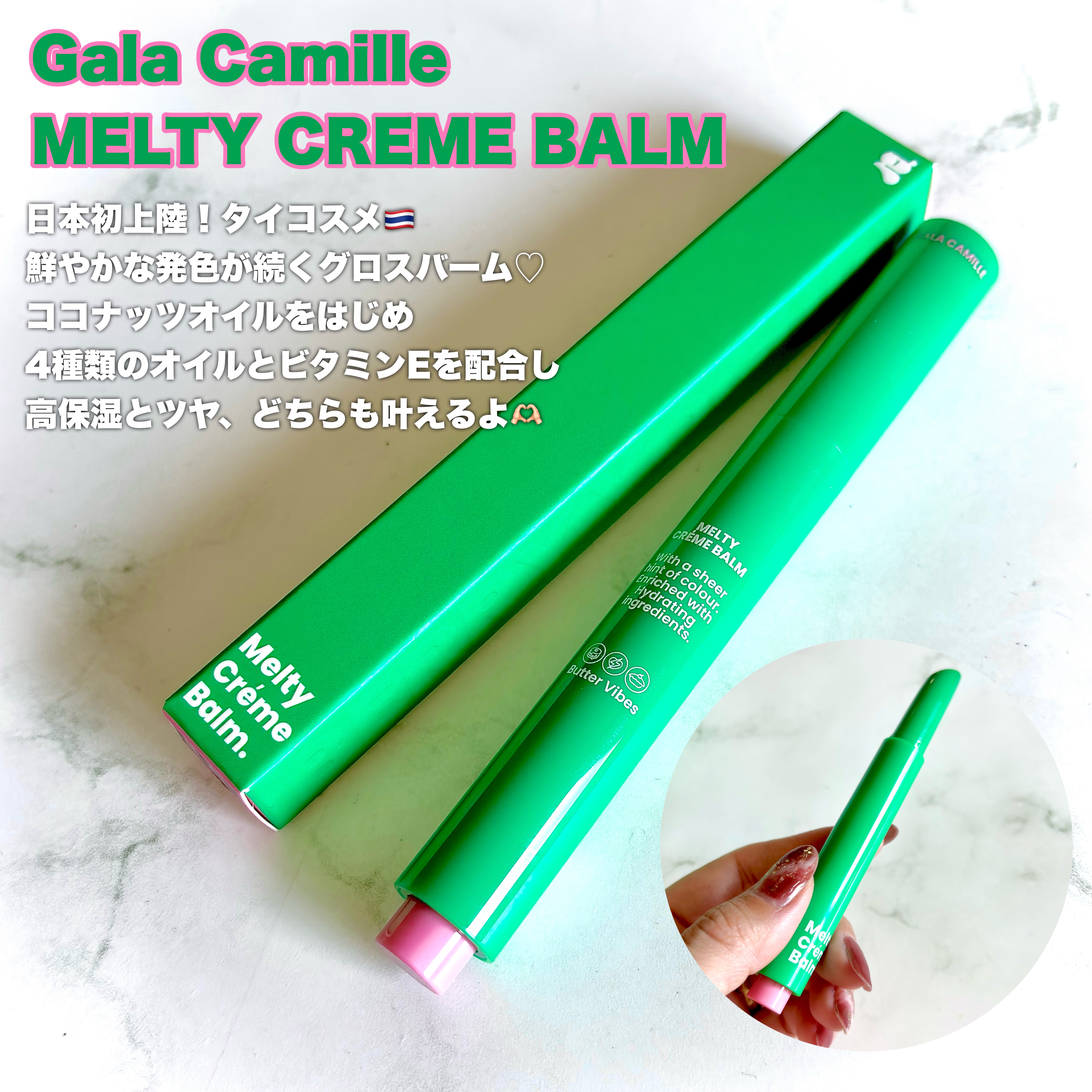 *-*-*-*-*-*-*-*♡♡♡GalaCamilleMELTYCREMEBALMココナッツオイルをはじめとした4種類のオイル配合のリップバーム🩷発色が良くスルスルとつけられるテクスチャー❣️くちびるが、カサついていてもひと塗りでツヤツヤ...