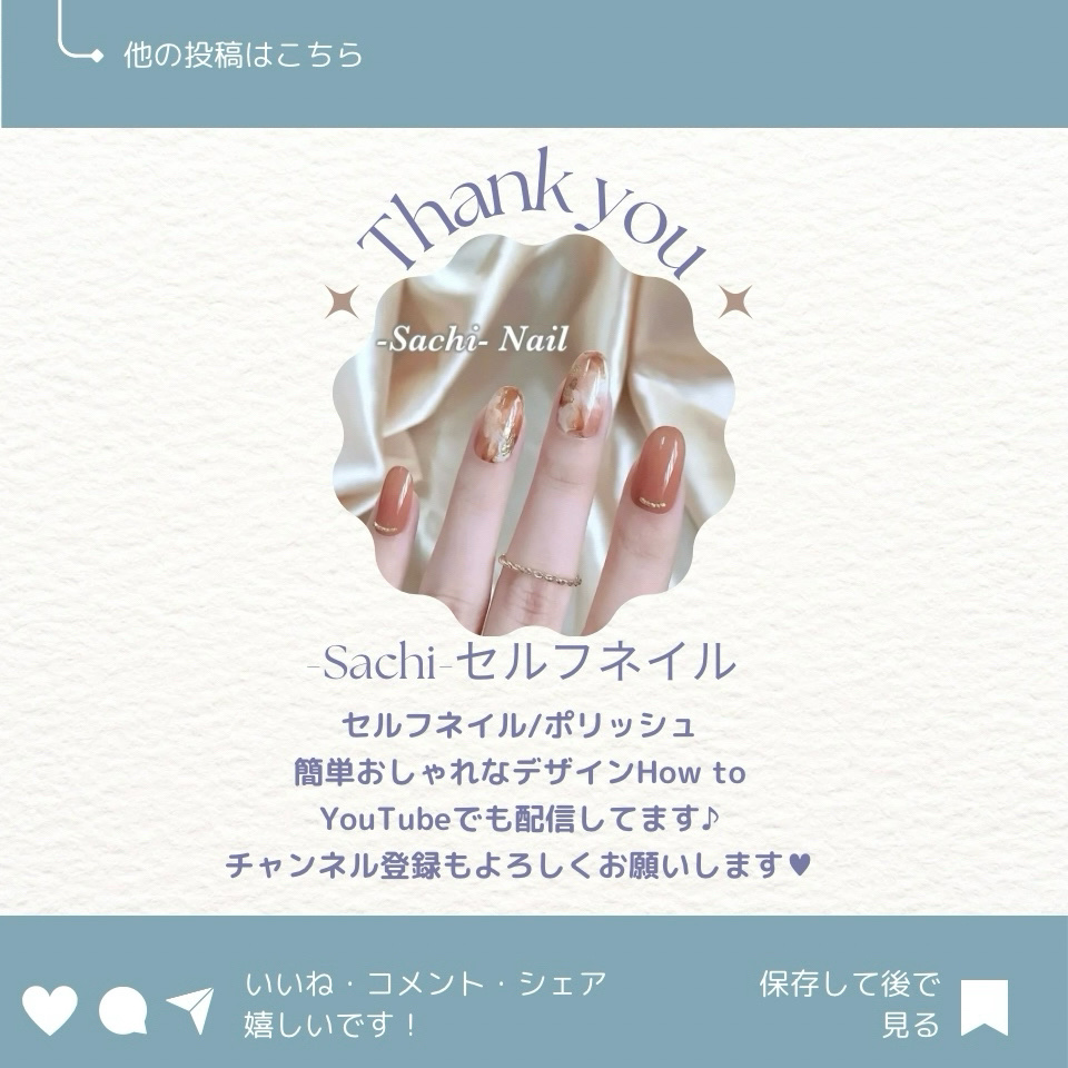 ワンカラーでも指ごとに色を変えるだけでオシャレに見えます💕 画像のようにゴールドラインとストーンを少し足すだけで華やかさがアップ🥰 何度かご紹介したことのあるスポンジで作るグラデーションです✨ スポンジを使うことで境目が綺麗に馴染んでくれます💕 アルミホイルの上でブラウンとトップコートを1:1くらいで混ぜたものを、トップコートのハケに取って3箇所に塗るだけ👌 事前に混ぜたものを塗ることで、爪の上でぼかすより簡単に出来ます💕 ベースカラーが乾く前に点置きしてぼかすことで綺麗にぼかせます✨ スピードが大事なので、使うポリッシュのキャップは全て開けておきましょう😊 天然石のラインはガタガタの方がより天然石っぽく見えるので、ラインを描くのが苦手な方でも大丈夫🙆♀️ 難しそうに見えて、やってみると意外と簡単に出来ます♡