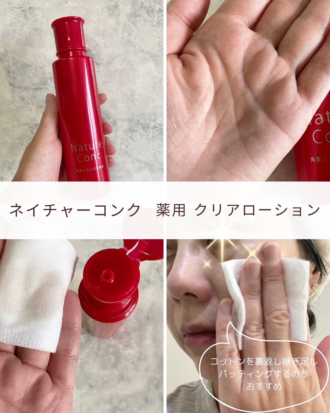 ネイチャーコンク❤薬用クリアローション化粧水としてだけじゃなく拭き取り、導入化粧水としても使えよ✨サラサラしたテクスチャーでさっぱりしてます☝🏻コットンに適量(500円玉大以上)を含ませてすべらせるように優しく拭き取ると古い角質や肌汚れをオフ...