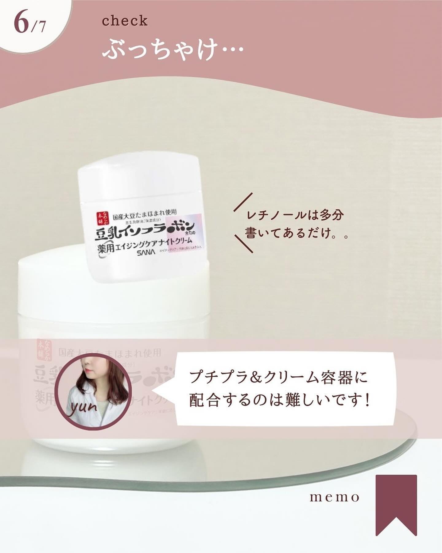 - <50g> ナイアシンアミド、水、BG、スクワラン、濃グリセリン、トリ2-エチルヘキサン酸グリセリル、バチルアルコール、硬化油、自己乳化型モノステアリン酸グリセリル、ステアリン酸、ジペンタエリトリット脂肪酸エステル(2)、メチルポリシロキサン、豆乳発酵液、レチノール油液、N-ステアロイルジヒドロスフィンゴシン、プルラン、エタノール、カルボキシビニルポリマー、グリコシルトレハロース・水添デンプン分解物混合溶液、ダイズエキス、パルミチン酸セチル、ヒドロキシエチルセルロース、フィトステロール、ベヘニルアルコール、水酸化K、水酸化Na、水素添加大豆リン脂質、フェノキシエタノール