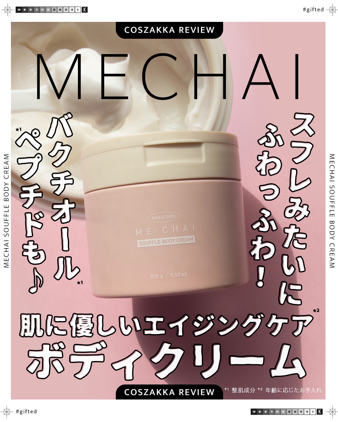 MECHAI(ミチャイ)バクチオールスフレボディクリームgiftedbyMECHAI【商品の特徴】☑︎幼い頃から肌悩みを抱え自身の肌悩みを解決したいという思いから誕生した会社員Aちゃんプロデュースのボディケアブランド☑︎レチノールと似た働きを...