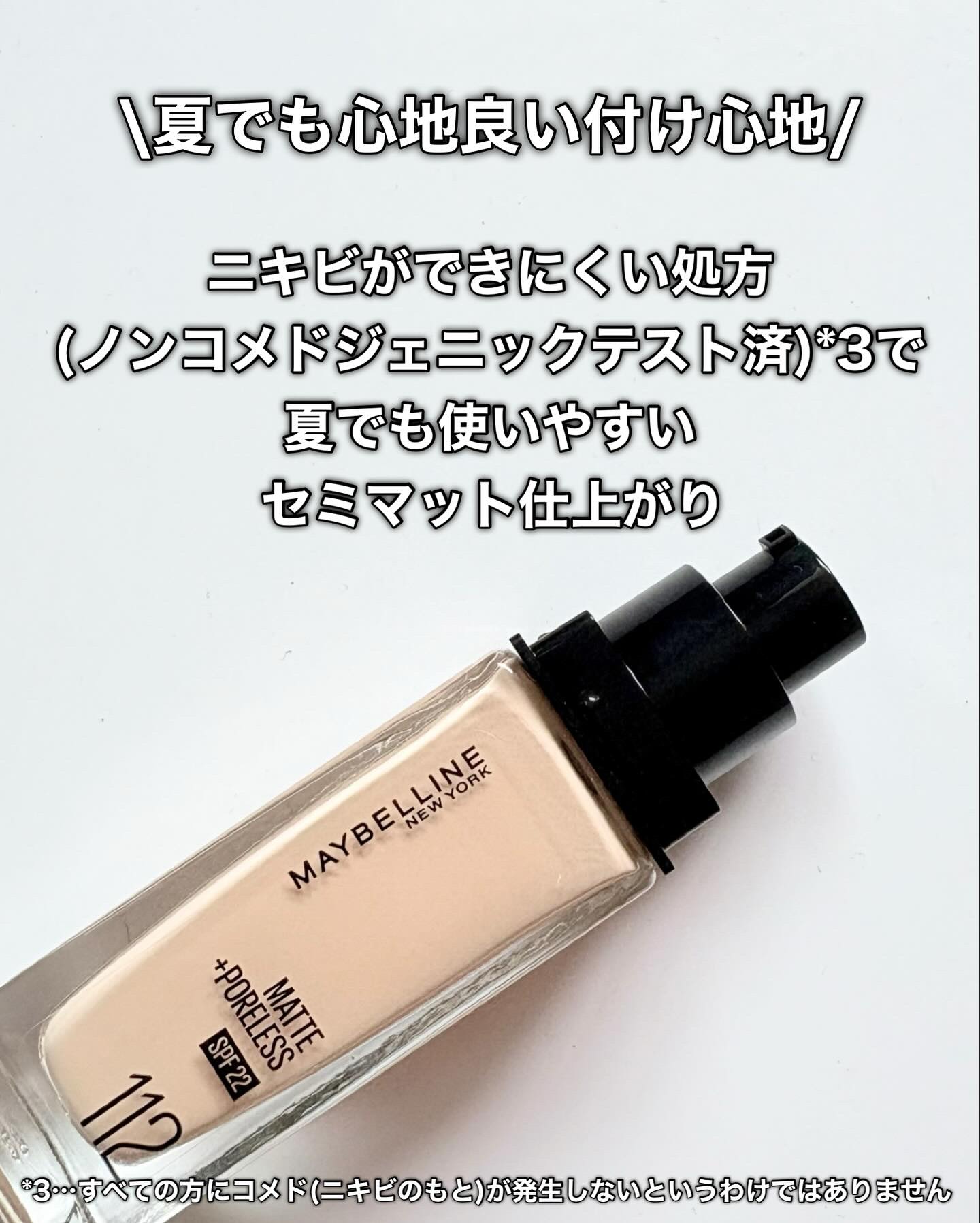 - 肌に溶け込むようになじんで、まるで素肌のような仕上がりのリキッドファンデーション。豊富なカラーバリエーションで妥協なく自分にぴったりの色が見つかります。エアロジェル*1を配合。油分を吸収してしっかり密着、崩れにくいのにうるおい感は残すので長時間心地よい*3。パウダーいらずで、夜までテカらないさらさら仕上がりが続きます。SPF22配合で夏の日差しにも。しっかりUVケアできます。 さらに肌に優しい! -ニキビができにくい処方(ノンコメドジェニックテスト済)*3 -皮膚科医協力のもとテスト済*4 -アレルギーテスト済*4 *1シリル化シリカ(油分吸収成分) *2 メイベリン ニューヨーク調べ。個人差があります。 *3すべての方にコメド(ニキビのもと)が発生しないというわけではありません。 *4すべての方に肌トラブルがおこらないというわけではありません。