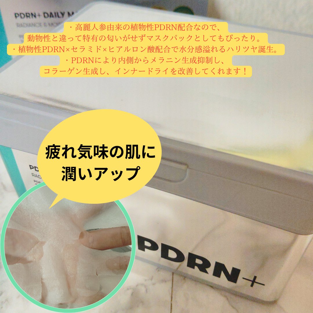 - 韓国で話題の植物性PDRN+™* 1日1PDRN+デイリーマスクで、ツヤのある健康な肌へ! ※DNA-Na、オタネニンジン根エキス(いずれも保湿) 「昨日の肌よりいい感じ。」をつくるPDRN+デイリーマスク 美肌力に欠かせない美容成分をたっぷり*含んだ高麗人参由来のPDRN+™*を配合 外部刺激によりゆらぎやすくなった肌にハリ&ツヤを与え、もちもちしたハリ&すこやかなツヤ感のある肌へ導きます