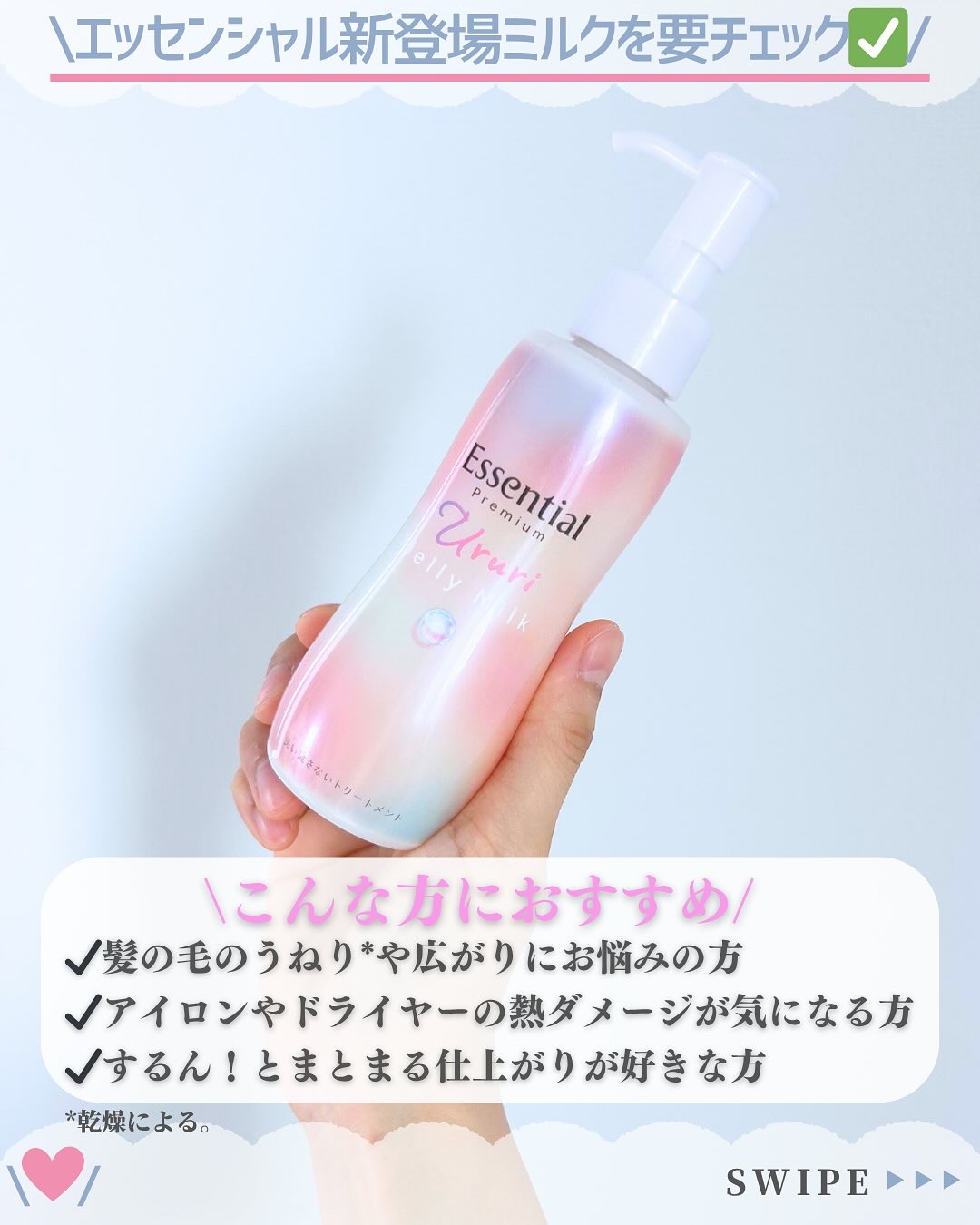 エッセンシャルさまからエッセンシャルプレミアムうるりジェリーミルクをいただきました♡🍑ぷるんとまとまり髪続く新感覚ジェリーミルク。🍑潤いチャージ&一晩中パックで、ぷるんとまとまる髪に。🍑翌朝のアイロンもするんときまる。🍑紫外線、摩擦などによる...