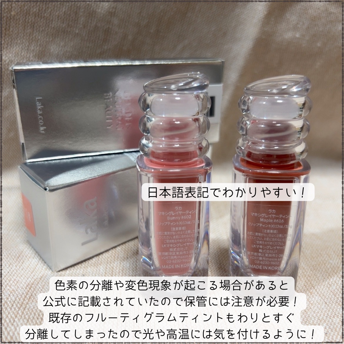 モニターキャンペーンに当選しLakaさまからいただきました♡発売後全色即完と話題になった新作!🏷️Lakaマキシグレイヤーティントカラーはランダムだったんだけれどとっても好みの602バニーが届きました🐰ツヤ感すごくて、色もちもそこそこしてくれ...