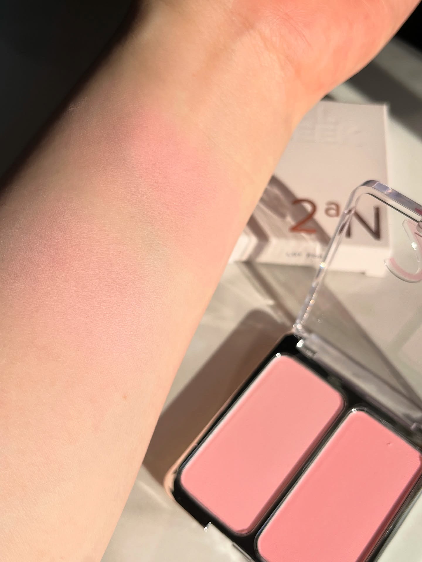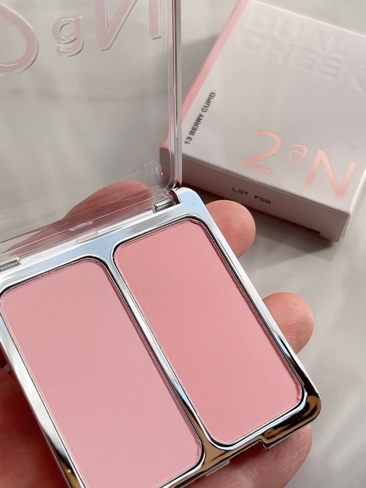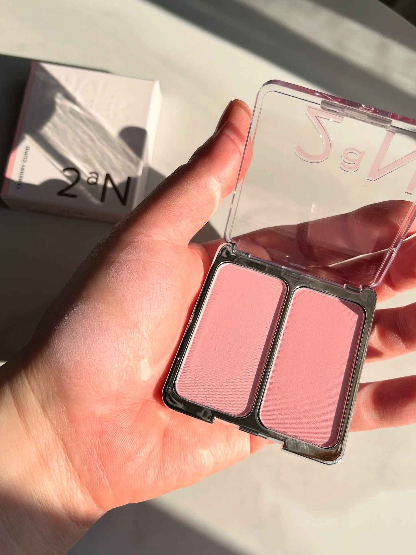 落ち着いたピンクベージュ🌷2aNデュアルチーク水彩画のような発色のデュアルチークパレット🎨二つのカラーが入っていて、単色でもミックスしても自然な可愛い仕上がりにマイクロブラーパウダーで毛穴や凹凸を補正したような透明感のあるすっきりとした肌を演...