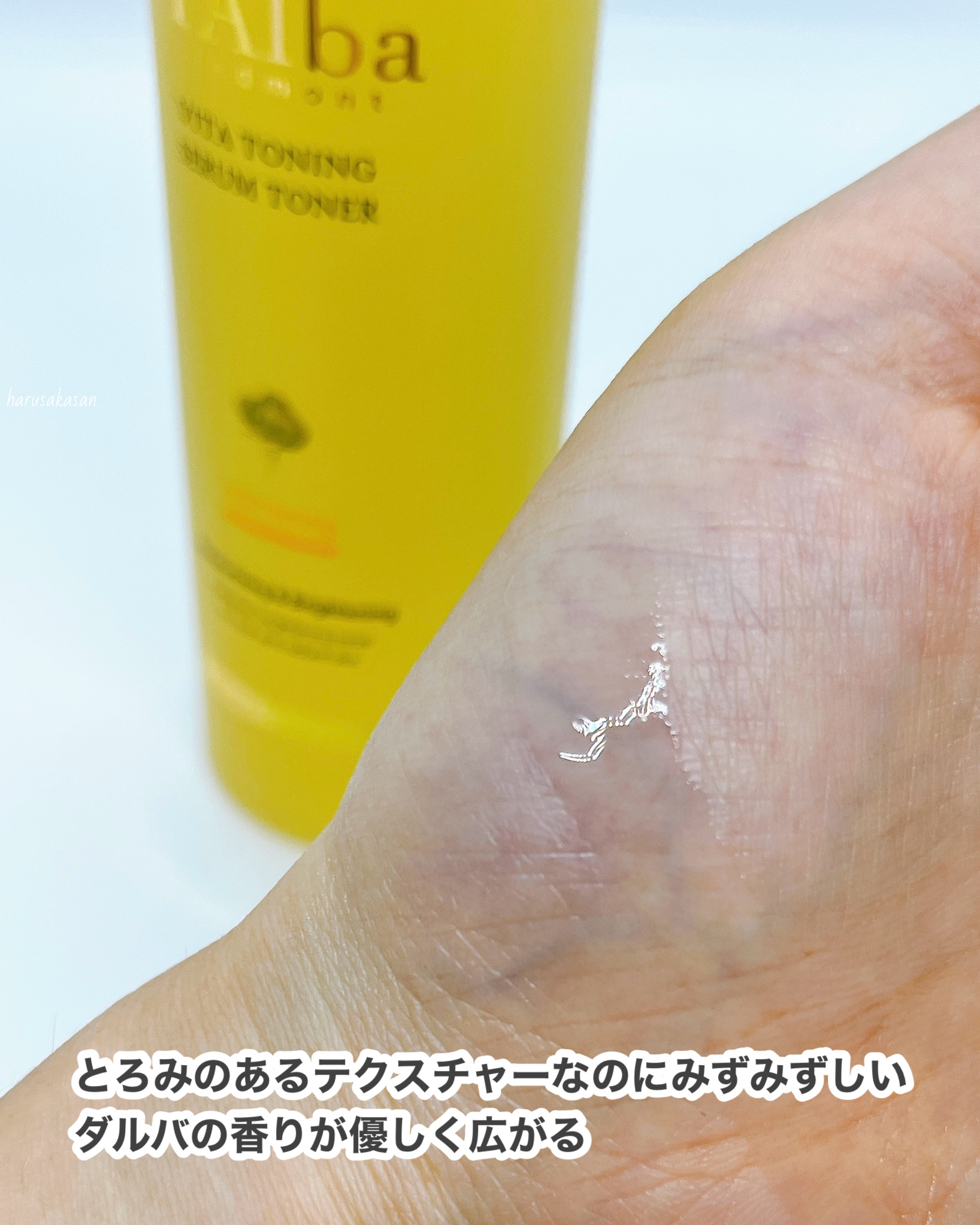 爽やかな香りが広がるビタミンたっぷりのセラムトナーでトーンケア&うるおいケア ややとろみのあるテクスチャーでしっとりみずみずしく水のように素早く肌に馴染む!! 特にすきなのが香りですね🌿 あの有名なダルバのミストと同じ、爽やかで癒される香り🌿✨