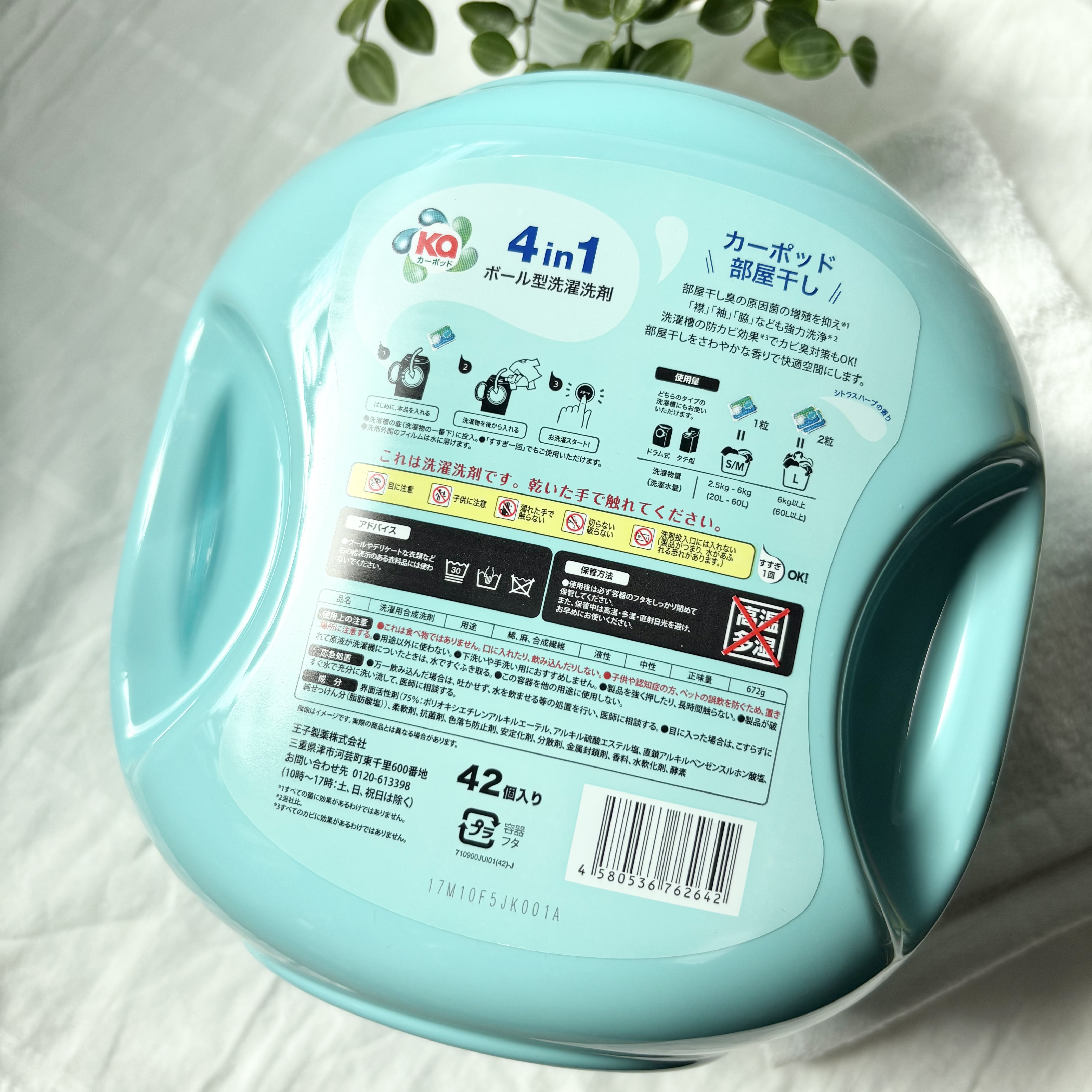 部屋干しする方におすすめ♡部屋干し臭・生乾き臭・干し忘れ臭の原因となる雑菌の繁殖を抑制し、さらに洗濯槽の防カビ効果でニオイ移りまで防いでくれるよ👏洗浄・抗菌・消臭力・柔軟効果を1粒に凝縮!4in1ボール型洗濯洗剤🫧衣類をしっかり洗い上げながら...