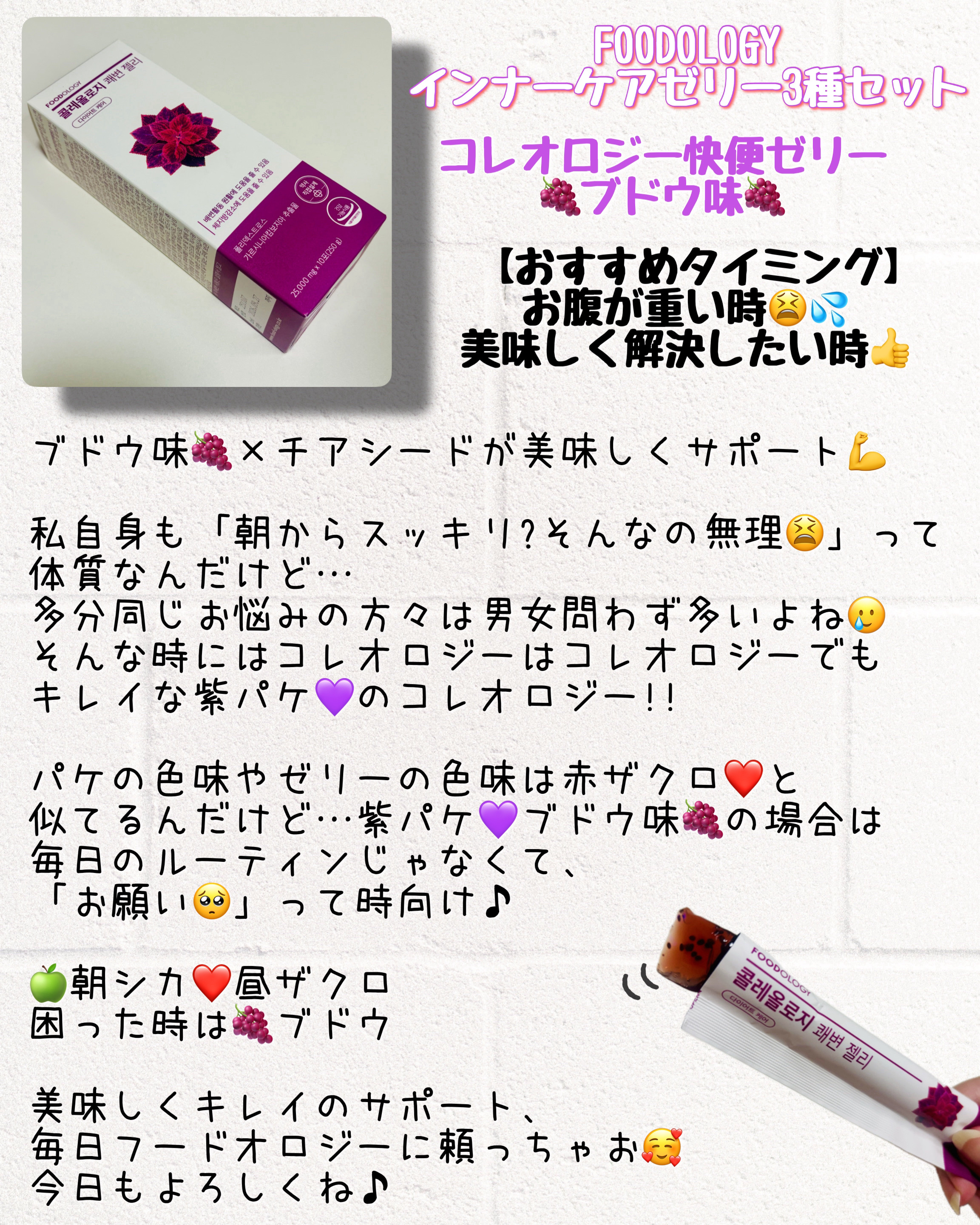 FOODOLOGYインナーケアゼリー3種セット▶︎コラーゲンセンテラゼリーハリと潤いのあるお肌に食べるスキンケア(シカゼリー)コラーゲン+センテラの整肌•保湿効果まで美味しい青りんご味朝のメイク前に摂取するのがおすすめ▶︎コレオロジーカットゼ...
