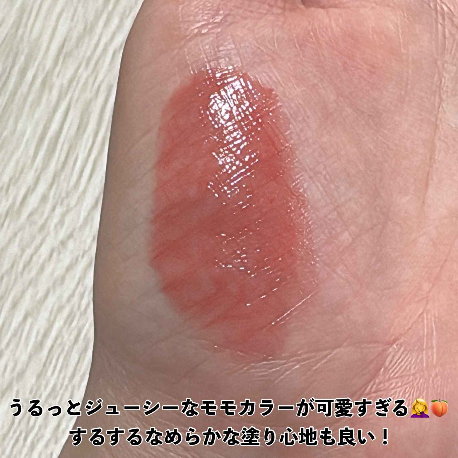 リニューアルしたジューシーラスティングティントがめっちゃ可愛かった🥹💗 まず容器!🫙 クリアなパッケージが可愛すぎてツボ⸜(*´꒳`*)⸝ 《23 PEACH PEACH ME》は白みピンクのモモカラー🍑 時間が経つと少し青みが出るけどそこまで塗りたての色と大きく変わらないからピュアなベビちゃん唇みたいになる👶🏻🍼 リニューアルして乾燥しにくく感じた! ツヤ感も綺麗に出てめっちゃ可愛い!もちろん色持ちの良さは変わらず良い👍🏻