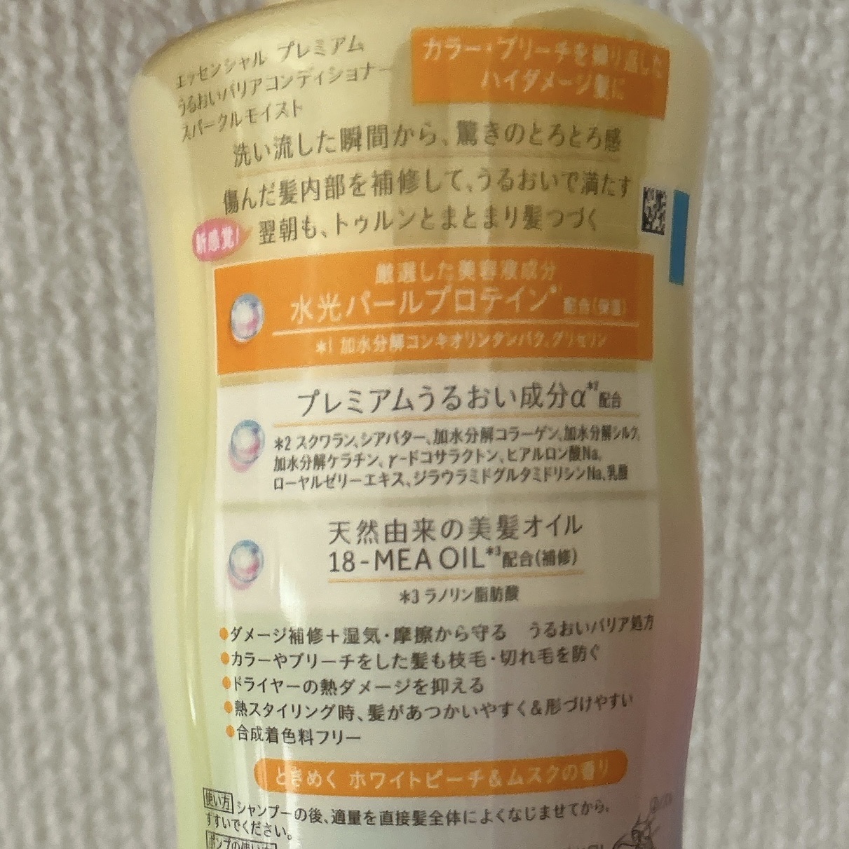 ハイダメージ髪向け!翌朝もとぅるんとまとまる髪へ!エッセンシャルプレミアムうるおいバリアシャンプースパークルモイストうるおいバリアコンディショナースパークルモイストカラー・ブリーチを繰り返したハイダメージ髪向けのシャンプー&トリートメントです...