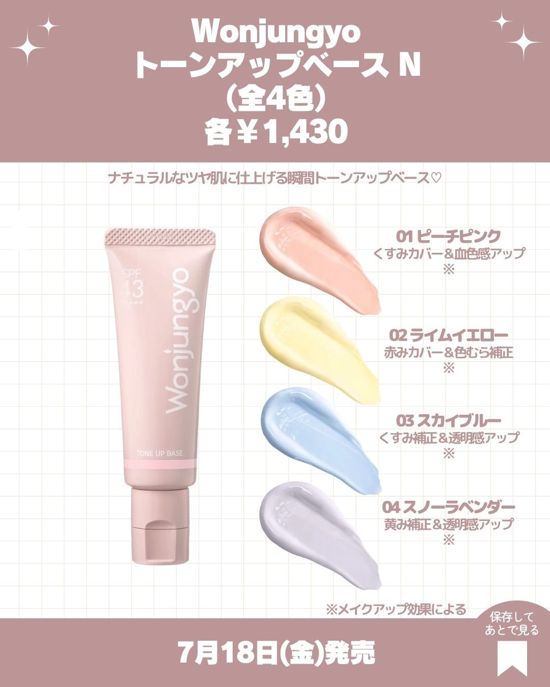 ꫛꫀꪝ!Wonjungyoから新作が登場🥹🤍୨୧୨୧WonjungyoウォンジョンヨトーンアップベースN01ピーチピンク02ライムイエロー03スカイブルー04スノーラベンダー¥1,430ウォンジョンヨアーティストタッチブラシ#01¥1,100...