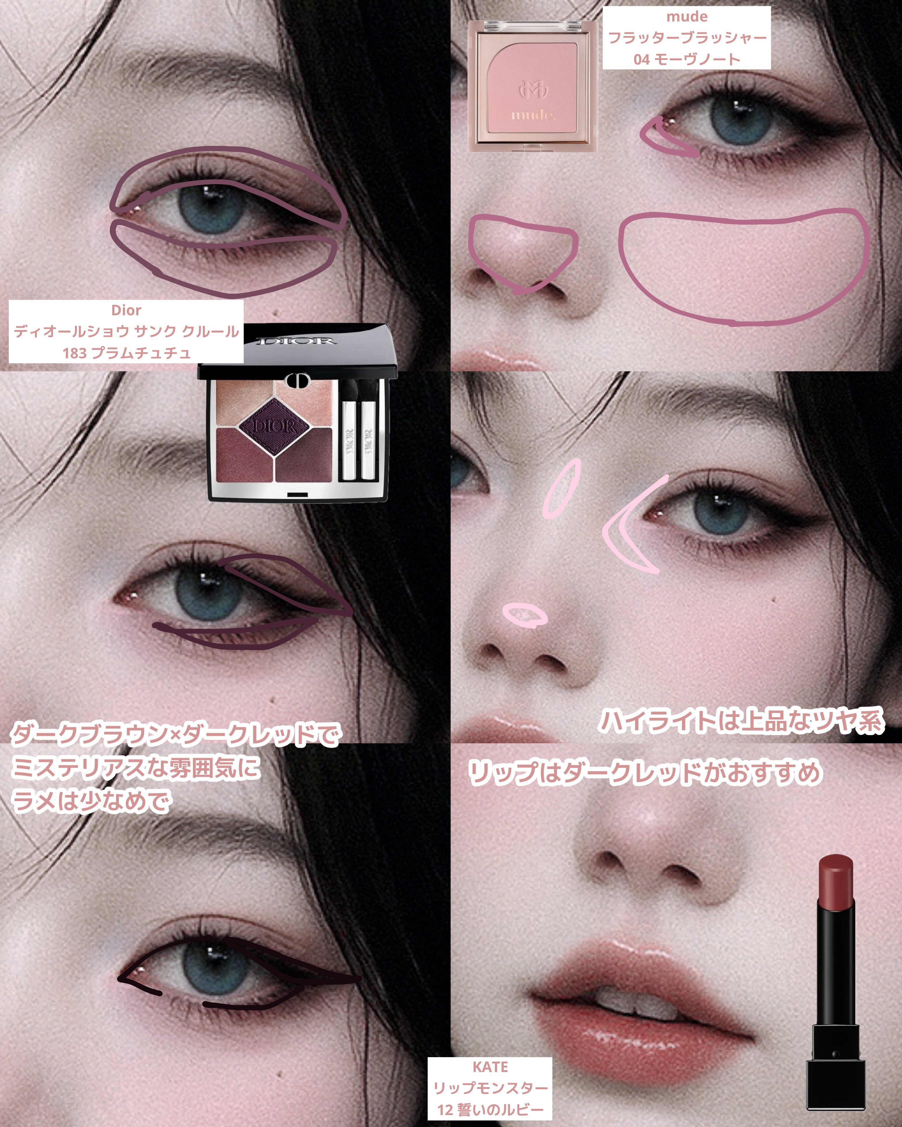 アイシャドウをグラデーションにするときに濃淡に気をつける。 アイラインはぶつっと途切れさせない! マスカラの色も重要で、ブラウンのマスカラを普段使っている方は少し赤みのあるブラウンマスカラを使ってみると、目元に自然な血色感がでてとってもおすすめです!