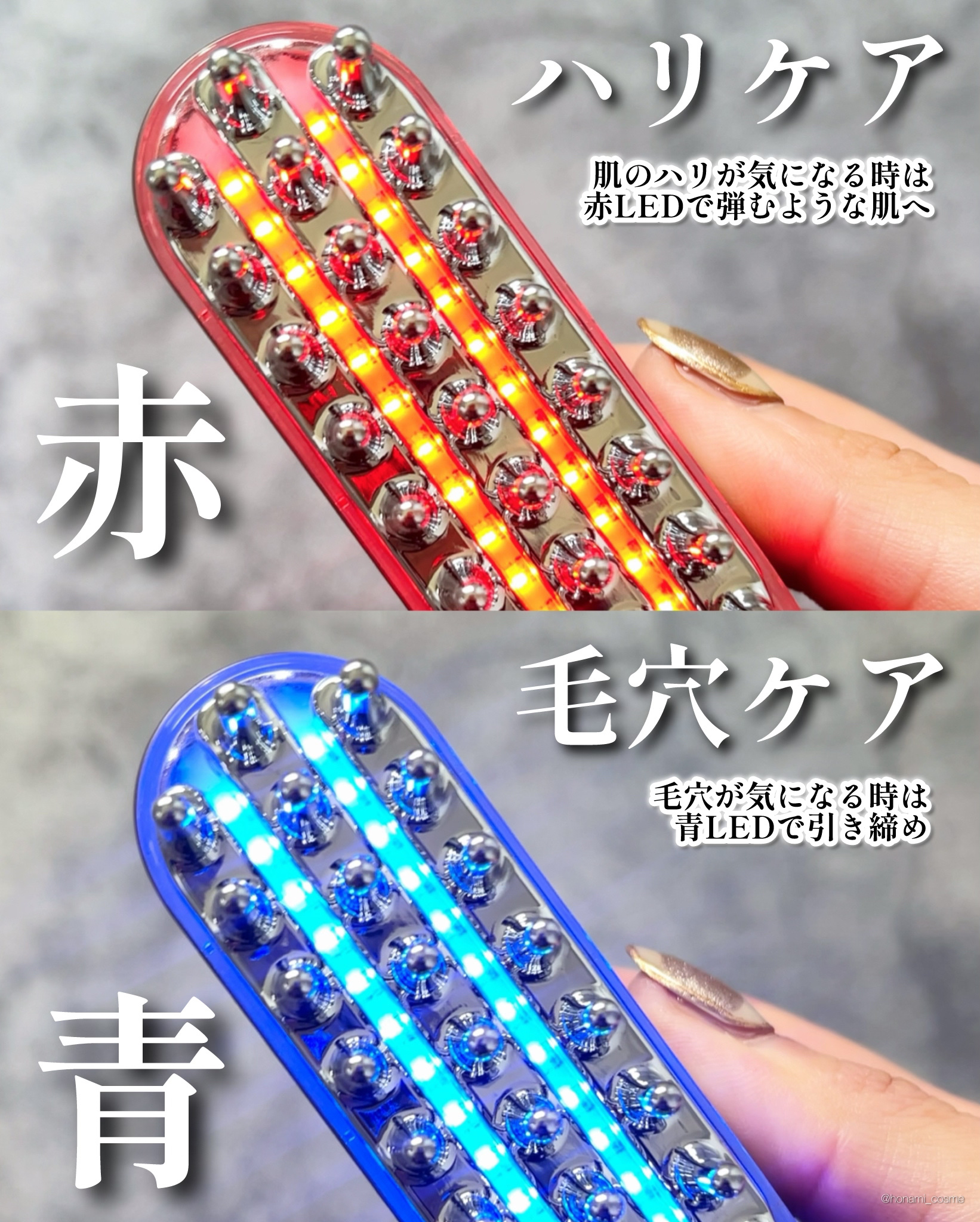 エイジングケアクリニック医師監修のスカルプ電気ブラシ。顔以外にも、頭皮や身体に使えるので1つで全身ケアできます。 防水仕様なので濡れた状態でも使用OK。頭皮や肌を濡らして使った方がより効果を体感できるそう。 肌悩みに合わせて選べる2色のLED(美肌ケア) 赤→肌のハリ不足が気になる時に 青→毛穴を引き締めたい時に。