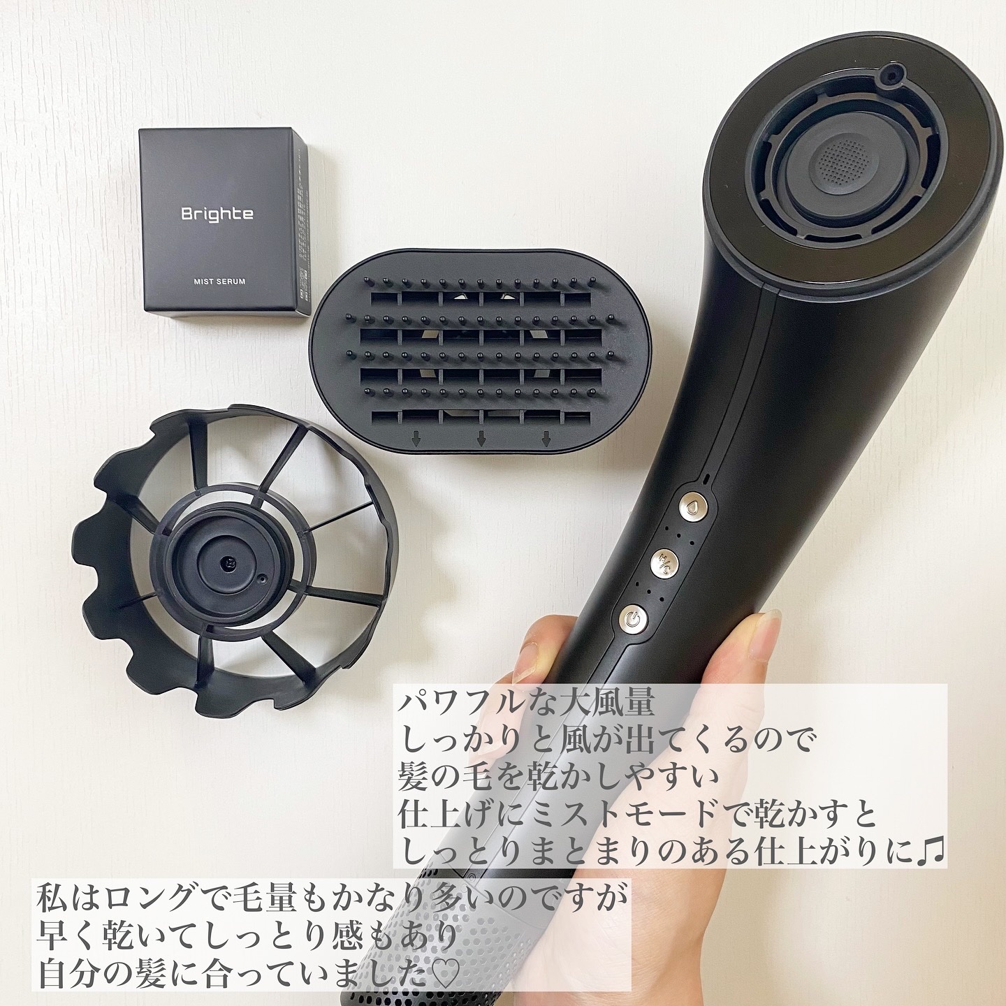 - ■ナノ化されたミストで髪の深部までうるおいケア 粒子サイズを1μm(0.001mm)前後にナノ化した美容液が、ドライヤーからミストとして噴射し髪に浸透します。ミストセラムに配合した髪の補修に優れた美髪成分(ヒアルロン酸*1、浸透型ケラチン*2、浸透型シルク*3等)が、髪の深層部にまでしっかり届くことで、髪本来の潤いを引き出し、毛先までしっとりとまとまりのある理想的な美髪を実現。乾かす時間を美容時間にアップデートします。 *1 ヒアルロン酸ナトリウム(補修) *2 加水分解ケラチン(補修) *3 加水分解シルク(補修) ■軽量なのに大風量でパワフル 約357g*1と軽量なボディでありながら、風量は驚くほどパワフル。超高速モーターと、飛行機のジェットエンジン機能を活かしたBrighte独自の技術で風路設計を最適化。2.58㎥/分*2という大風量で圧倒的な速乾を実現しました。 *1本体のみ *2自社測定、ブーストアタッチメント装着、3段風量(強)時 ■美髪テクノロジー搭載 ・すぐれた熱伝導性と電気伝導性を兼ね備えた「グラフェン」の遠赤外線 ヘッド部分の中央に、すぐれた熱伝導性と電気伝導性を兼ね備えた素材「グラフェン」を採用。 表面だけ乾燥した髪はうねりの原因に。 グラフェンが放出する遠赤外線により熱分散がより均一になり、髪の内側からやさしく乾かします。 生乾きすることなく乾かしすぎを防ぎ、最適な水分バランスを実現します。 ・デュアルイオンテクノロジー効果 プラスとマイナス両イオンを備えたBrighte 独自のデュアルイオンテクノロジーの相乗効果で、髪の毛一本一本をケア。 プラスイオンで髪の表面を整えながら、マイナスイオンで静電気を抑え髪のまとまりを向上させます。 ・頭皮にうれしいLEDテクノロジー 吹出口周辺には、エイジングケア*する赤色LEDと、頭皮のベタつきを抑え整肌する青色LEDを搭載し、髪だけでなく頭皮環境にもアプローチします。 *年齢に応じたケア