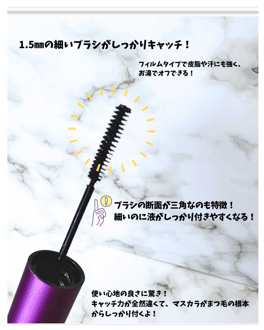 - ロングでもボリュームでもない、「自まつげを際立てる」という新発想 “見えないまつげ”も1本残らず際立てて、目ヂカラを最大限に引き出す 1.うぶ毛レベルの“見えないまつげ”も際立てる「高密着フィルム」 2.あらゆるまつげも1本残らず際立てる「超極細三角ブラシ」