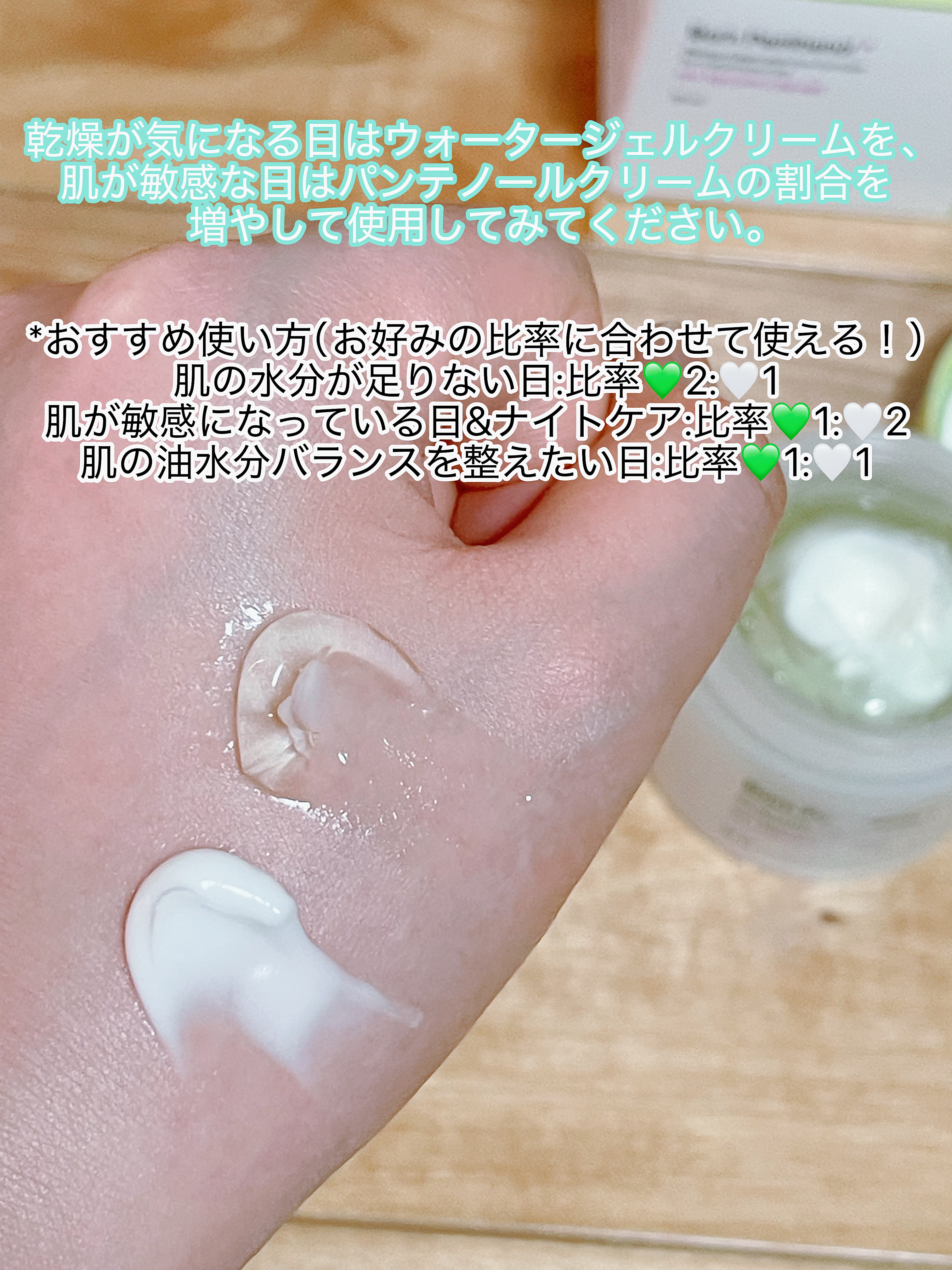 - 毎日変わる肌のコンディションに合わせて自分だけの肌レシピを作れるカスタマイズクリーム うるおいたっぷりのウォータージェルクリームと水分補給&生き生きとした肌印象に導くパンテノールクリームで同時にダブルケアができるこだわりアイテム。 べたつきなく柔らかいテクスチャーの2つのクリームが肌のコンディションを整え、もちっとハリ感のある肌へと導きます。 [使い方] 1)洗顔後、化粧水や美容液で肌を整えた後に、スパチュラで肌のコンディションによって、ウォータージェルクリームとパンテノールクリームを適量を取り、 混ぜ合わせてから顔全体に優しく塗り伸ばします。 *毎日変わる肌のコンディションに合わせて、乾燥が気になる時はウォータージェルクリームを、敏感に傾いた肌を整えたい時にはパンテノールクリームの量を多めにMIXして使用するのがおすすめです。