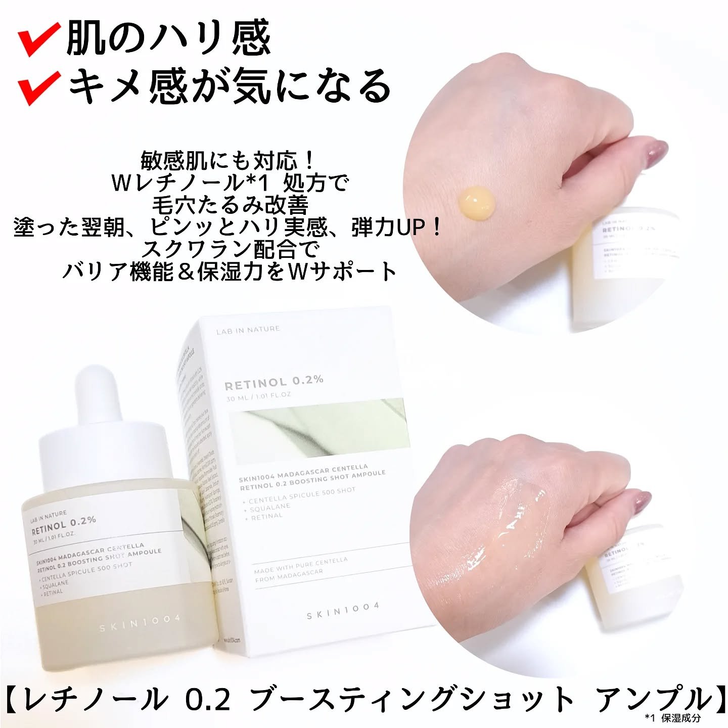 SKIN1004の攻めのスキンケア🧴肌悩みに合わせて選べるアンプル✨レチノール:ハリナイアシンアミド:毛穴・ツヤマトリキシル:弾力ボリュームアップ【肌のハリ感・キメ感が気になる方に!】◾︎レチノール0.2ブースティングショットアンプルハリ感と...