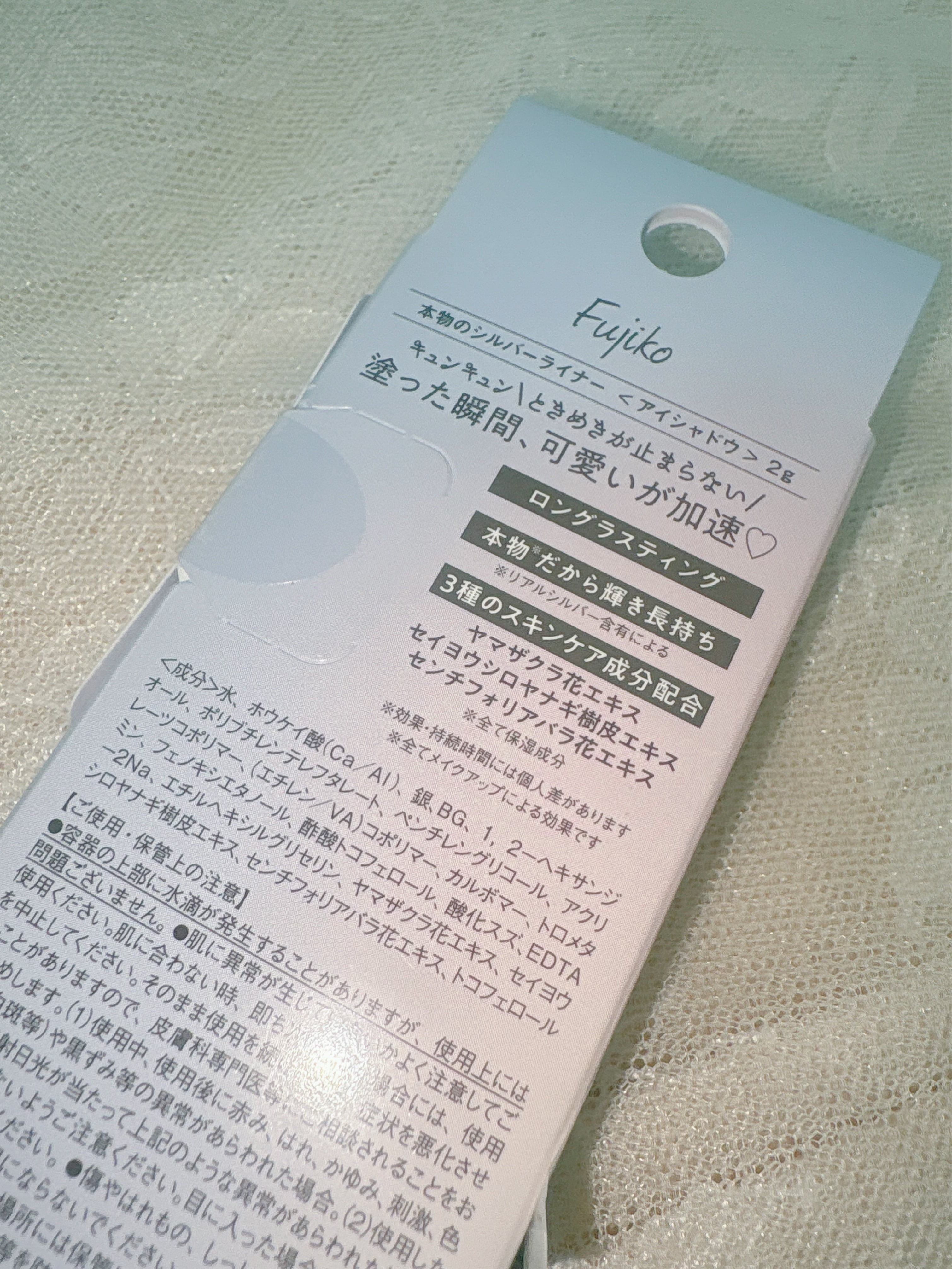 - <本物のシルバーライナー> 水、ホウケイ酸(Ca/Al)、銀、BG、1,2-ヘキサンジオール、ポリブチレンテレフタレート、ペンチレングリコール、アクリレーツコポリマー、(エチレン/VA)コポリマー、カルボマー、トロメタミン、フェノキシエタノール、酢酸トコフェロール、酸化スズ、EDTA-2Na、エチルヘキシルグリセリン、ヤマザクラ花エキス、セイヨウシロヤナギ樹皮エキス、センチフォリアバラ花エキス、トコフェロール