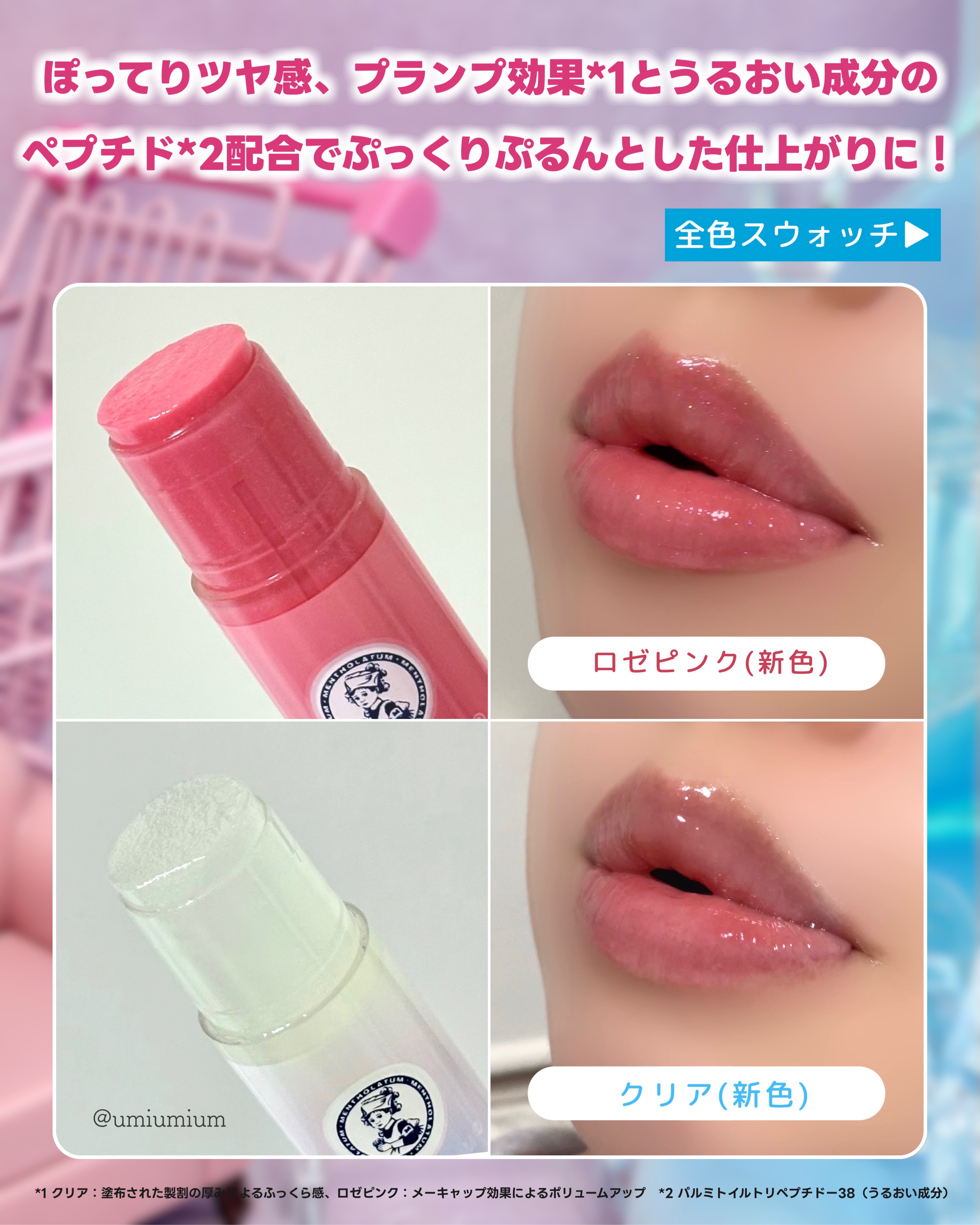 - <クリア> ダイマージリノール酸ダイマージリノレイル、(イソステアリン酸ポリグリセリル2/ダイマージリノール酸) コポリマー、ラノリン、オクチルドデカノール、ホホバ種子油、ジブチルラウロイルグルタミド、ミリスチン酸デキストリン、オリーブ果実油、ローヤルゼリーエキス、ハチミツ、パニリルブチル2、メントキシプロパンジオール、メントール、ハッカ葉油、レモン果皮油、ラバンデュラヒブリダ油、イタリアイトスギ葉/実/茎油、イソステアリン酸ソルビタン、ラブダナム油、ヒメマツバボタンエキス、ダマスクバラ花ロウ、ヤシ脂肪酸スクロース、パルミトイルトリペプチド-381、メトキシケイヒ酸エチルヘキシル、ペンチレングリコール、ポリシリコーン-15、t-ブチルメトキシジベンゾイルメタン、エチルヘキサン酸セテアリル、BG、水 <ヌードベージュ> ダイマージリノール酸ダイマージリノレイル、(イソステアリン酸ポリグリセリル2/ダイマージリノール酸) コポリマー、ラノリン、オクチルドデカノール、ホホバ種子油、ジブチルラウロイルグルタミド、ミリスチン酸デキストリン、メトキシケイヒ酸エチルヘキシル、ペンチレングリコール、トリイソステアリン酸ポリグリセリル-2、メントール、酸化チタン、ポリシリコーン-15、t-ブチルメトキシジベンゾイルメタン、酸化鉄、メントキシプロパンジオール、香料、赤104(1) 水酸化Al、バニリルブチル、オリーブ果実油、ハチミツ、ダマスクバラ花ロウ、エチルヘキサン酸セテアリル、BG、水、ハッカ葉油、レモン果皮油、ラバンデュラヒブリダ油、イタリアイトスギ葉/実/茎油、ヒメマツバボタンエキス、ラブダナム油、イソステアリン酸ソルビタン、ローヤルゼリーエキス、ヤシ脂肪酸スクロース、パルミトイルトリペプチド-38 <ベビーピンク> ダイマージリノール酸ダイマージリノレイル、イソステアリン酸ポリグリセリル2/ダイマージリノール酸)コポリマー、ラノリン、オクチルドデカノール、ホホバ種子油、ジブチルラウロイルグルタミド、ミリスチン酸デキストリン、メトキシケイヒ酸エチルヘキシル、ペンチレングリコール、メントール、トリイソステアリン酸ポリグリセリル-2、酸化チタン、ポリシリコーン-15、t-ブチルメトキシジベンゾイルメタン、メントキシプロパンジオール、香料、黄4、赤202、赤104 (1) 水酸化AI、赤201、バニリルブチル、オリーブ果実油、ダマスクバラ花ロウ、ハチミツ、エチルヘキサン酸セテアリル、BG、水、ハッカ葉油、レモン果皮油、ラバンデュラヒブリダ油、イタリアイトスギ葉/実/茎油、イソステアリン酸ソルビタン、ラブダナム油、ヒメマツバボタンエキス、ローヤルゼリーエキス、ヤシ脂肪酸スクロース、パルミトイルトリペプチド-38 <プラムレッド> ダイマージリノール酸ダイマージリノレイル、(イソステアリン酸ポリグリセリル2/ダイマージリノール酸)コポリマー、ラノリン、オクチルドデカノール、ホホバ種子油、ジブチルラウロイルグルタミド、ミリスチン酸デキストリン、メトキシケイヒ酸エチルヘキシル、ペンチレングリコール、メントール、トリイソステアリン酸ポリグリセリル-2、t-ブチルメトキシジベンゾイルメタン、ポリシリコーン-15、赤202、メントキシプロパンジオール、グンジョウ、香料、赤104(1)、黄4、バニリルプチル2、オリーブ果実油、ハチミツ、ダマスクバラ花ロウ、エチルヘキサン酸セテアリル、BG、水、ハッカ葉油、レモン果皮油、ラバンデュラヒブリダ油、イタリアイトスギ葉/実/莖油、ヒメマツバボタンエキス、ラブダナム油、イソステアリン酸ソルビタン、ローヤルゼリーエキス、ヤシ脂肪酸スクロース、パルミトイルトリペプチド-38 <ロゼピンク> ダイマージリノール酸ダイマージリノレイル、(イソステアリン酸ポリグリセリル2/ダイマージリノール酸) コポリマー、ラノリン、オクチルドデカノール、ホホバ種子油、ジブチルラウロイルグルタミド、ミリスチン酸デキストリン、オリーブ果実油、ローヤルゼリーエキス、ハチミツ、バニリルプチル2、メントキシプロパンジオール、メントール、ハッカ葉油、レモン果皮油、ラバンデュラヒブリダ油、イタリアイトスギ葉/実/莖油 イソステアリン酸ソルビタン、ラブダナム油、ヒメマツバボタンエキス、ダマスクバラ花ロウ、ヤシ脂肪酸スクロース、パルミトイルトリペプチド-381、メトキシケイヒ酸エチルヘキシル、ペンチレングリコール、トリイソステアリン酸ポリグリセリル-2、エチルヘキサン酸セテアリル、BG、水、酸化チタン、ホウケイ酸(Ca/Al)、ポリシリコー15、t-ブチルメトキシジベンゾイルメタン、合成フルオロフロゴパイト、黄4、赤202、赤104 (1) シリカ、赤201、酸化鉄、水酸化Al、酸化スズ、香料
