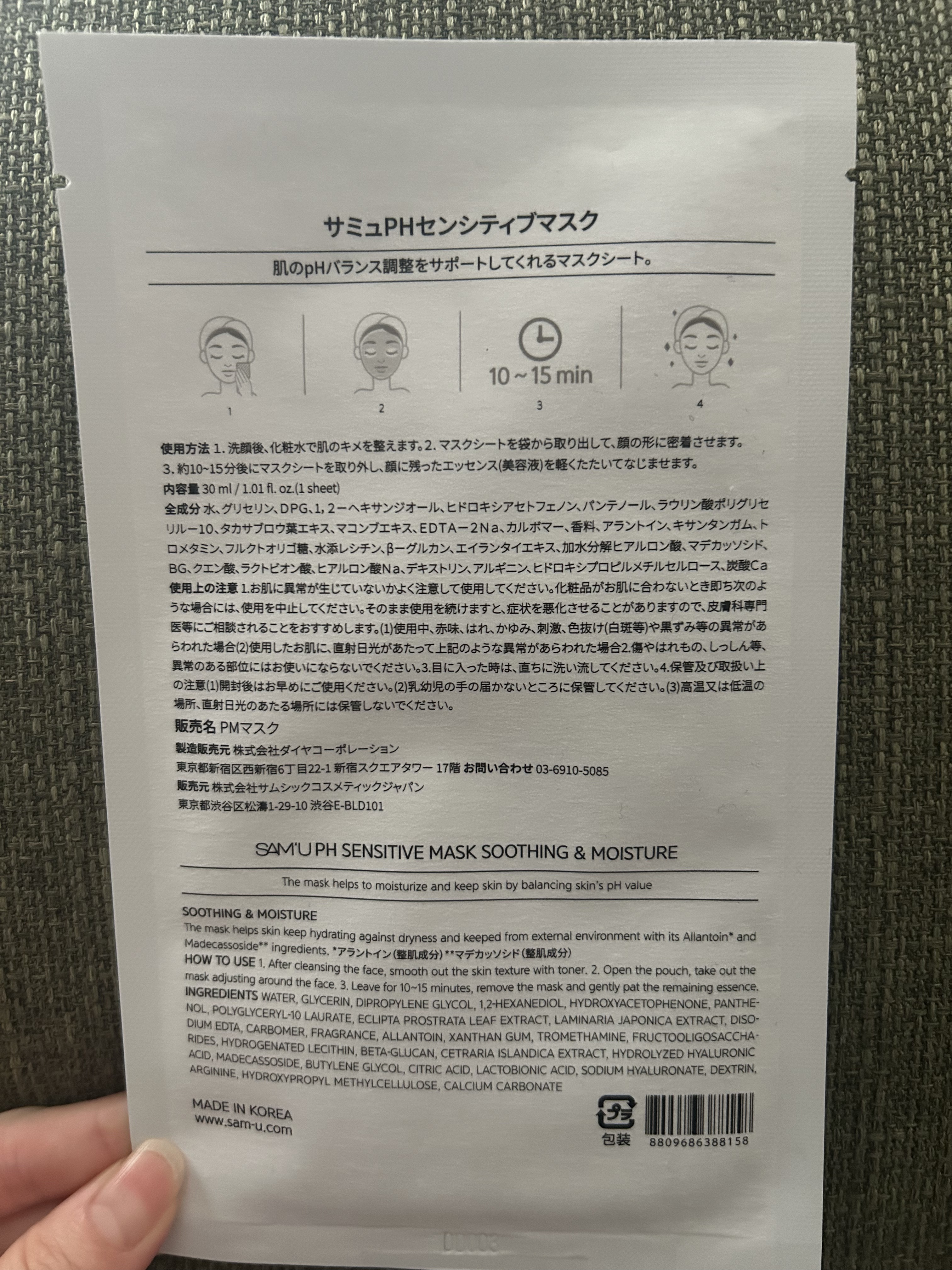 - <PHセンシティブマスクスージング&モイスト> 水、BG、グリセリン、ヒアルロン酸Na、加水分解ヒアルロン酸、キサンタンガム、カルボマー、香料、アルギニン、DPG、水添レシチン、クエン酸、ヒドロキシプロピルメチルセルロース、デキストリン、パンテノール、1,2-ヘキサンジオール、アラントイン、EDTA-2Na、マデカッソシド、ラウリン酸ポリグリセリル-10、トロメタミン、ヒドロキシアセトフェノン、ラクトビオン酸、β-グルカン、炭酸Ca、タカサブロウ葉エキス、フルクトオリゴ糖、エイランタイエキス、コンブエキス