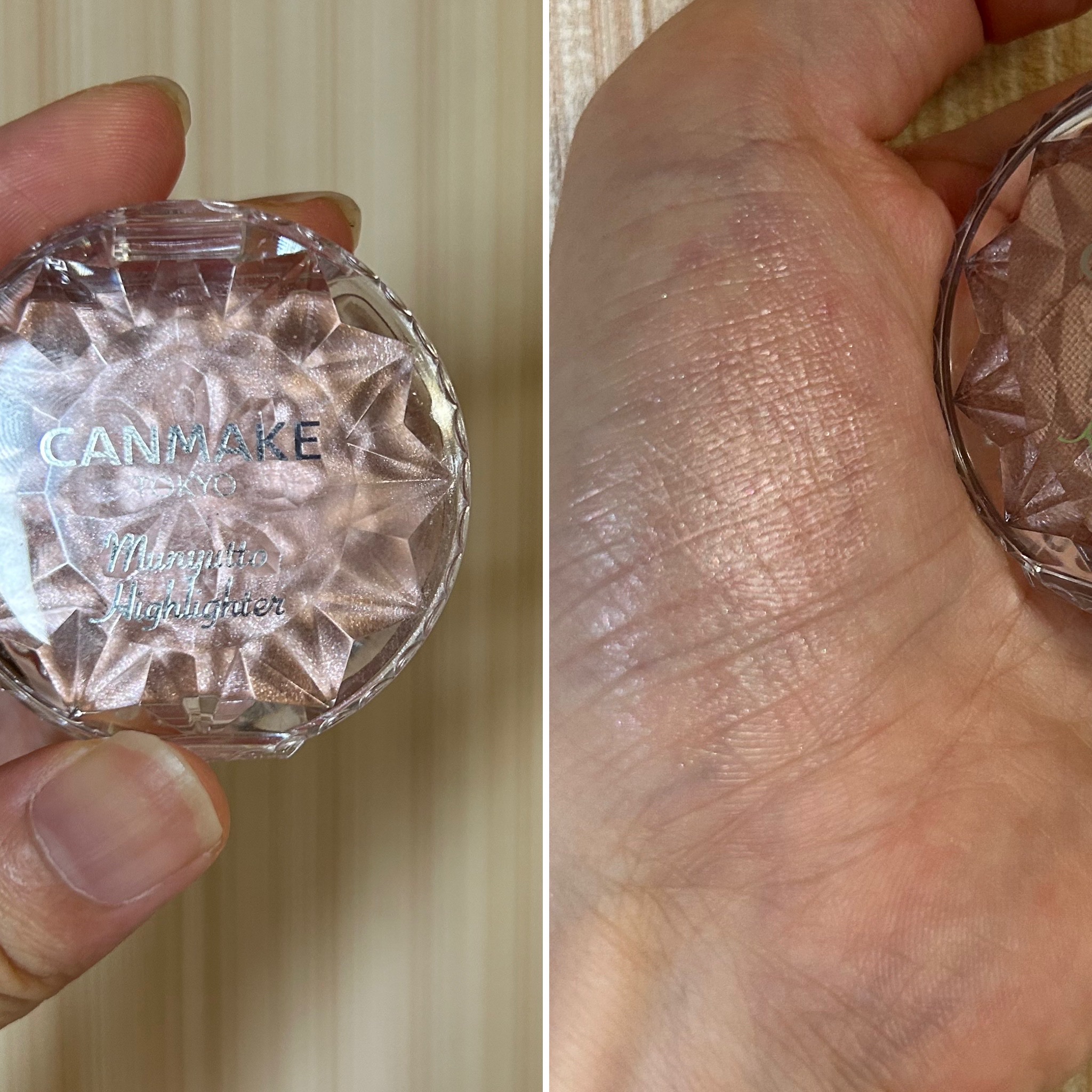 ちょうどいいラメ感と色味が気に入った!! スウォッチしてみるとパープルっぽく見えるけど、ほっぺたに馴染ませるとキナリのようなラメ感が際立ってこれだ!!!って感じました! チーク、アイメイク、リップとして使えるので統一感あるメイクができそうです。 ラメの大きさといい、色味といい完璧でした。