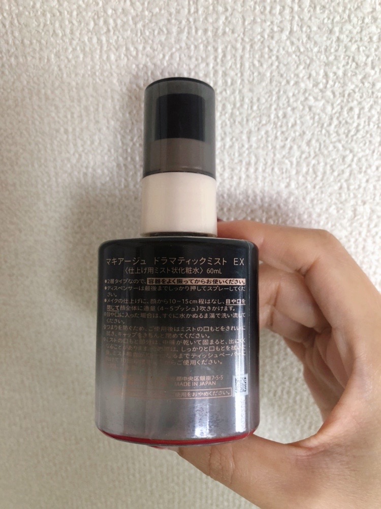 - <ドラマティックミスト EX> 水、エタノール、ジメチコン、(トリメチルシロキシケイ酸/ジメチコノール)クロスポリマー、グリセリン、ジフェニルシロキシフェニルトリメチコン、塩化Na、ラウリルベタイン、カニナバラ果実エキス、シャクヤク根エキス、アセチルヒアルロン酸Na、水溶性コラーゲン、BG、クエン酸Na、メタリン酸Na、クエン酸、ピロ亜硫酸Na、ミリスチン酸イソプロピル、トリフルオロアルキルジメチルトリメチルシロキシケイ酸、フェノキシエタノール、安息香酸Na、安息香酸、香料