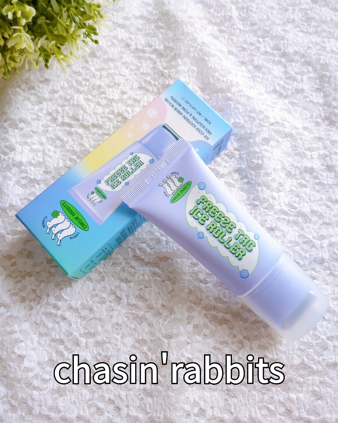 ヒヤッ🐧ほてった肌の鎮静剤CHASIN'RABBITSフリーズタグアイスローラー香り;うっすらラベンダーの香りテクスチャ;水っぽいローション触感;冷たく感じる日焼け止めを塗ってもどうしたって日にさらされて火照っていく肌にレスキューアイテム登場...