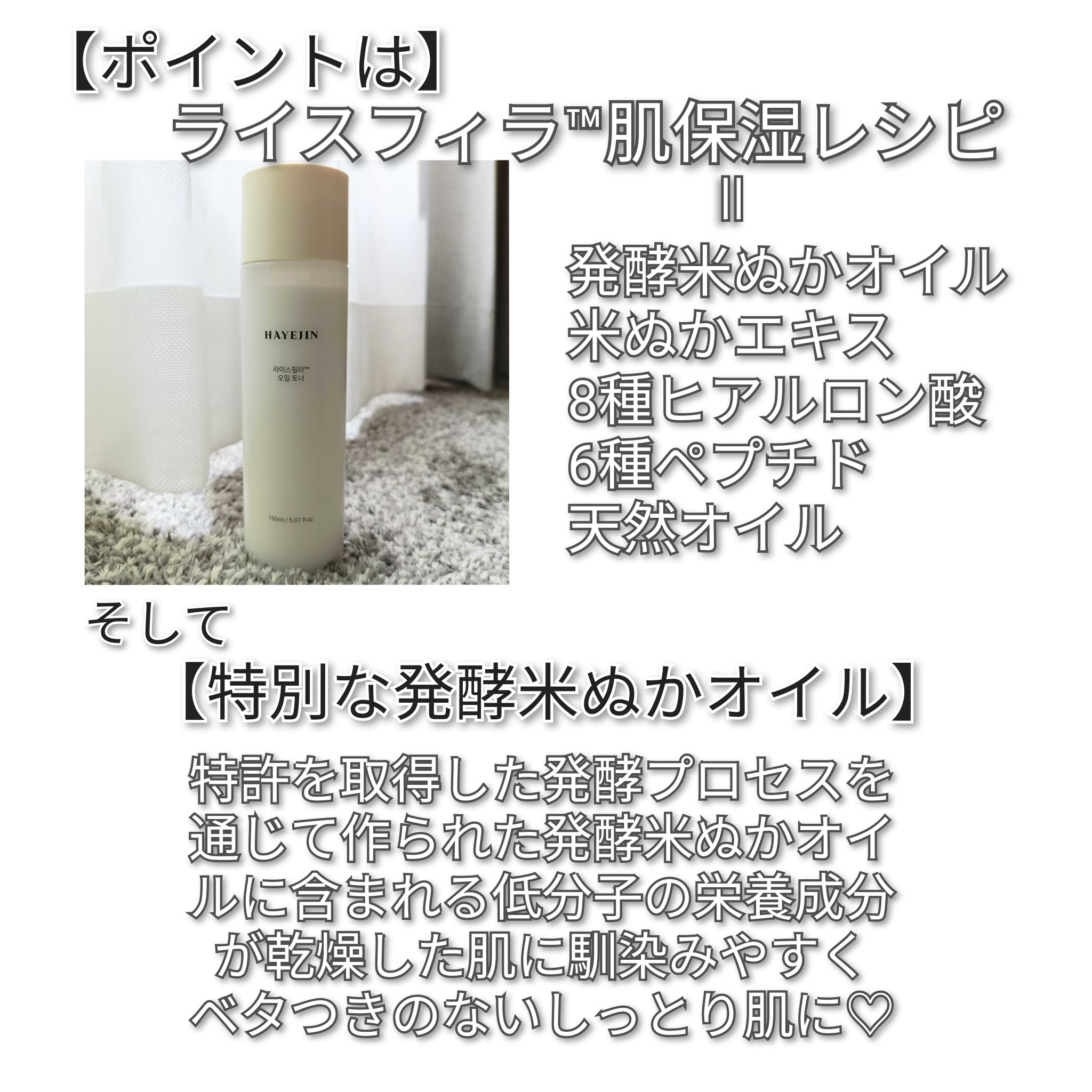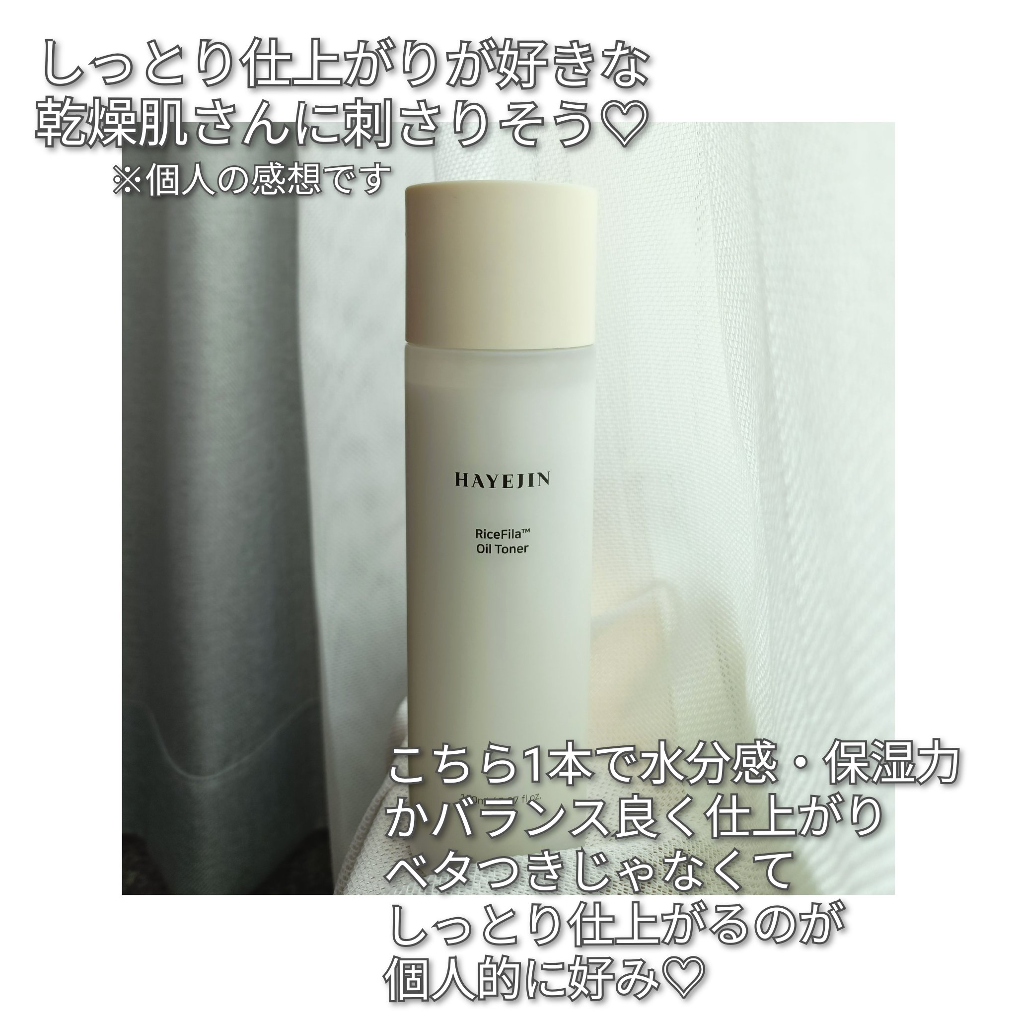 HAYEJINライスピラーオイルトナートナーとクリームが1つに✨二層に分かれているので、使う前にシェイク!水分と油分のバランスが良く、しっとりなめらかなテクスチャー♡オイルトナーだけど、軽くて使いやすい✨コットンパックをして集中ケアも◎オール...