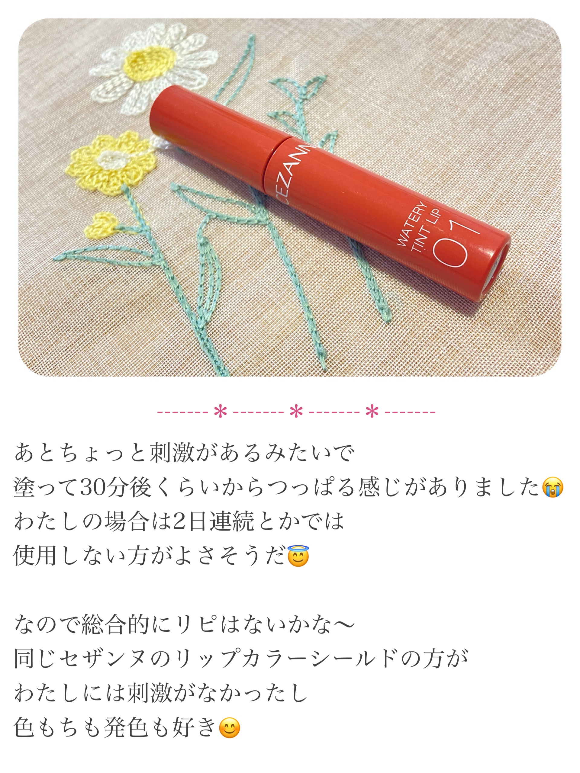 - ツヤ×色×潤いをキープする、セザンヌの新濡れツヤリップ みずみずしい濡れツヤ感ある仕上がりで、発色とツヤが長続きするティントリップです。ティントの発色を透明のベールで覆うリップコートのような処方で、ツヤ感と色をキープします。さらに、唇表面のべたつきは少なく、しっとり潤うオイルinウォーター処方を採用しています。