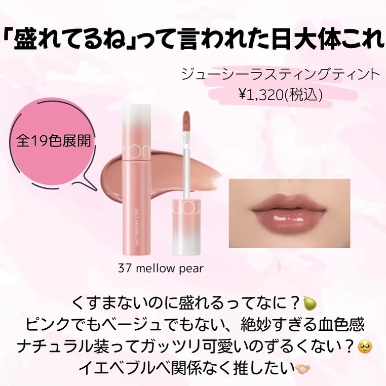 | リップティントランキング第3位 | 重ねて塗っても、ちゅるんと透け感が残って明るめカラーがとっても映える…💕色残りも◎ | 詳細を見る | ||