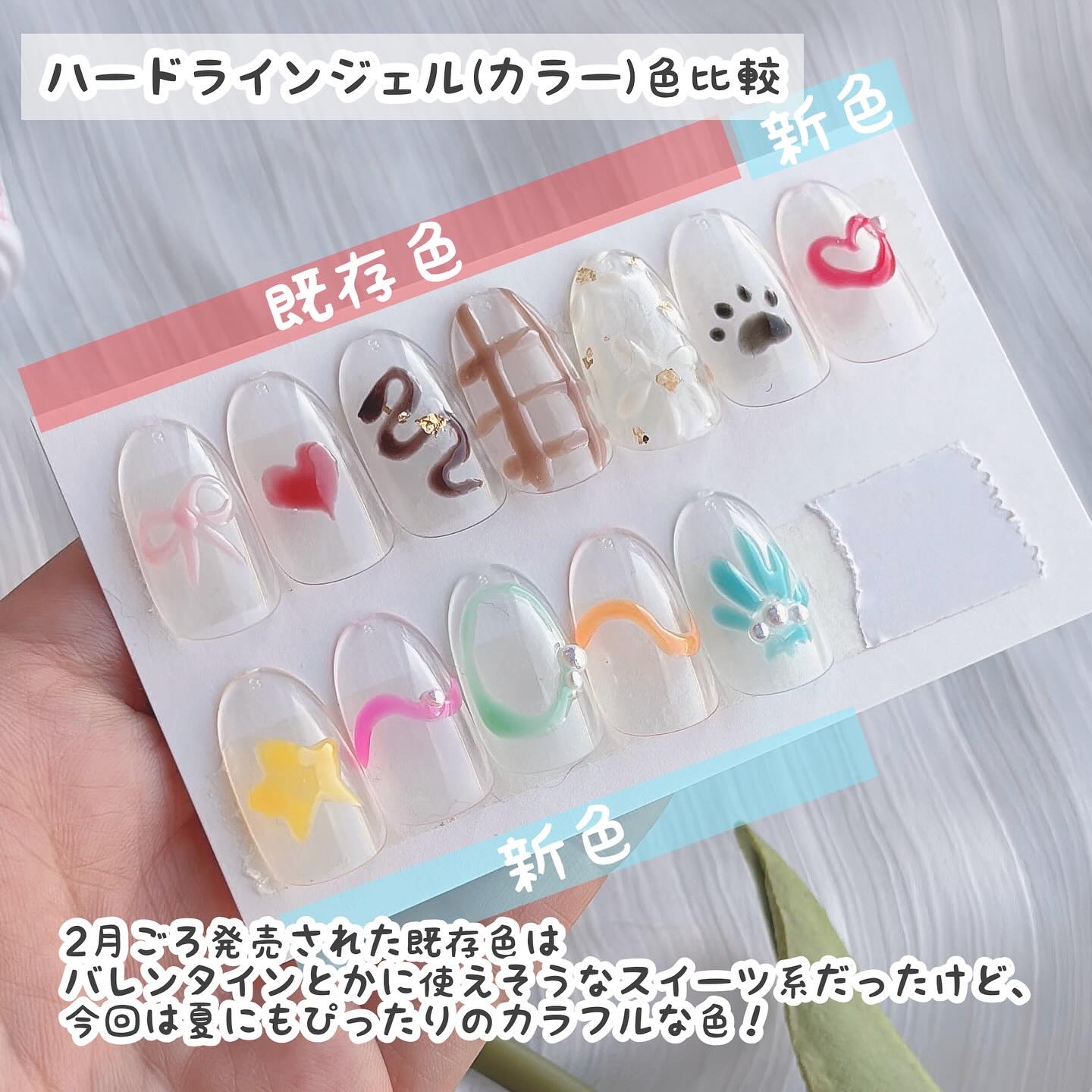 ダイソージェル東京ガールズコレクショAWコラボ限定新色ー🥰カラーチャートとアレンジいろいろ!20色出てて、その中でも話題になってるのが繊維入りのフラッフィーシリーズ!10色あるよ☺️ダイソーで是非チェックしてみて〜!カラーチャートは下半分が1...