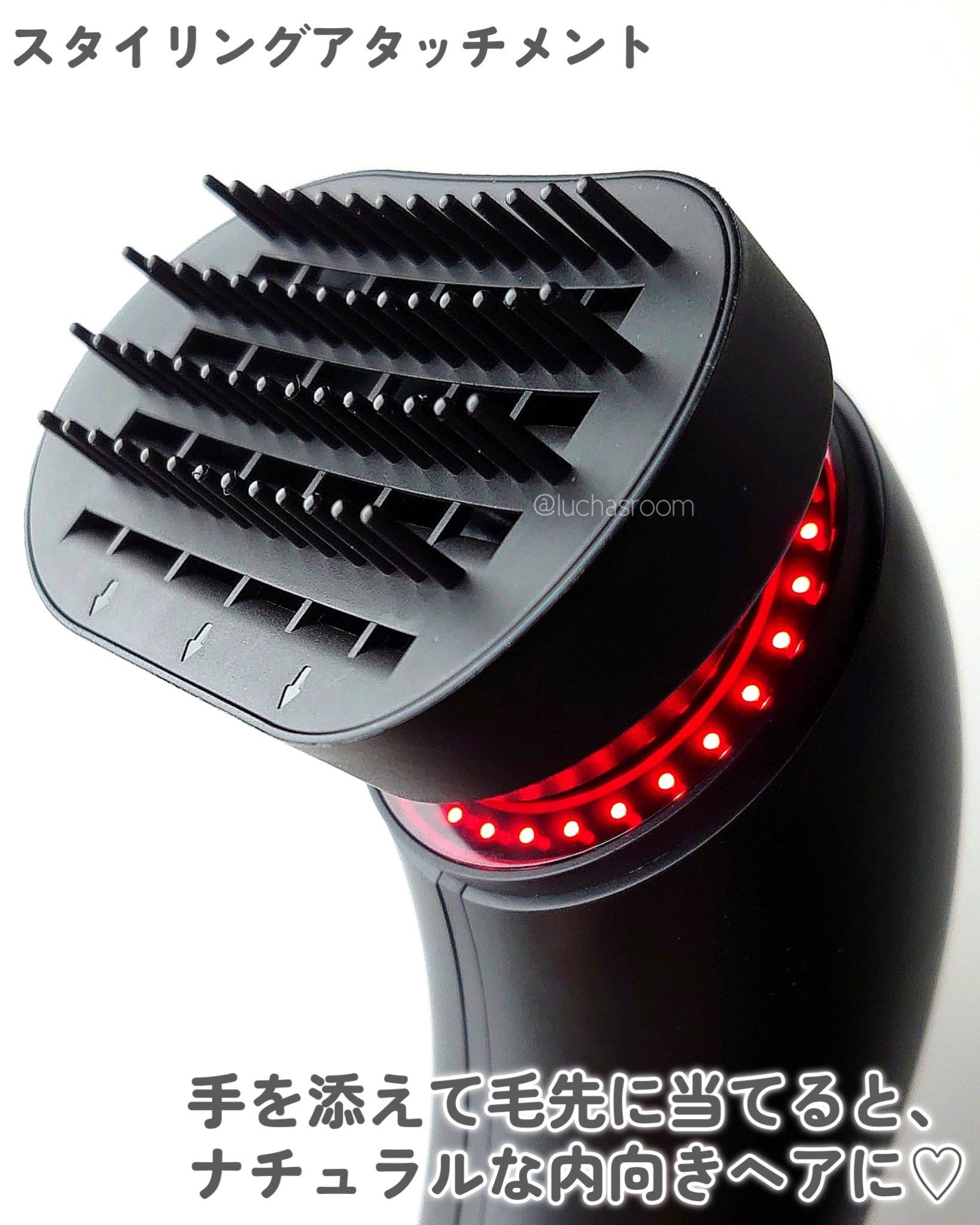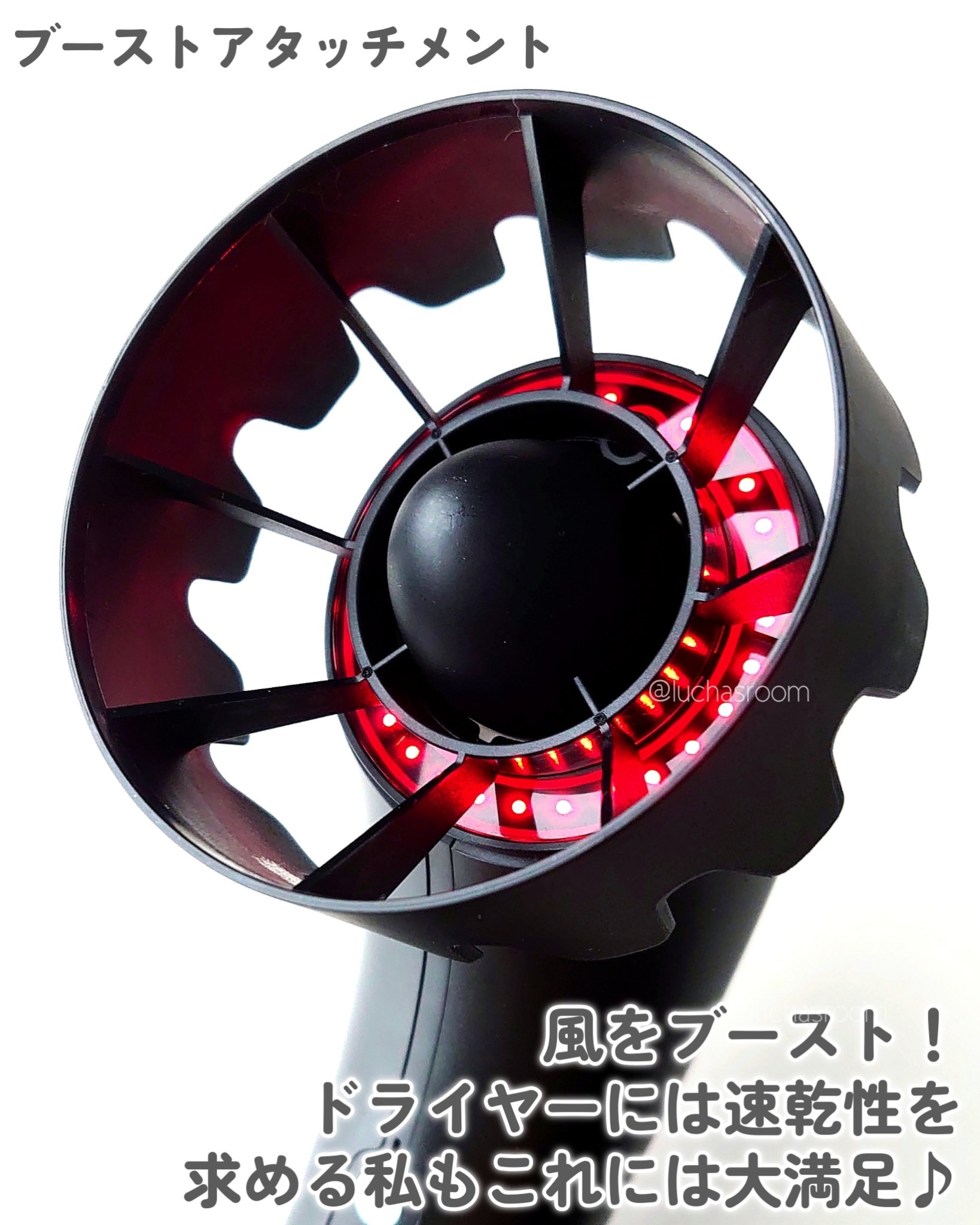 - ■ナノ化されたミストで髪の深部までうるおいケア 粒子サイズを1μm(0.001mm)前後にナノ化した美容液が、ドライヤーからミストとして噴射し髪に浸透します。ミストセラムに配合した髪の補修に優れた美髪成分(ヒアルロン酸*1、浸透型ケラチン*2、浸透型シルク*3等)が、髪の深層部にまでしっかり届くことで、髪本来の潤いを引き出し、毛先までしっとりとまとまりのある理想的な美髪を実現。乾かす時間を美容時間にアップデートします。 *1 ヒアルロン酸ナトリウム(補修) *2 加水分解ケラチン(補修) *3 加水分解シルク(補修) ■軽量なのに大風量でパワフル 約357g*1と軽量なボディでありながら、風量は驚くほどパワフル。超高速モーターと、飛行機のジェットエンジン機能を活かしたBrighte独自の技術で風路設計を最適化。2.58㎥/分*2という大風量で圧倒的な速乾を実現しました。 *1本体のみ *2自社測定、ブーストアタッチメント装着、3段風量(強)時 ■美髪テクノロジー搭載 ・すぐれた熱伝導性と電気伝導性を兼ね備えた「グラフェン」の遠赤外線 ヘッド部分の中央に、すぐれた熱伝導性と電気伝導性を兼ね備えた素材「グラフェン」を採用。 表面だけ乾燥した髪はうねりの原因に。 グラフェンが放出する遠赤外線により熱分散がより均一になり、髪の内側からやさしく乾かします。 生乾きすることなく乾かしすぎを防ぎ、最適な水分バランスを実現します。 ・デュアルイオンテクノロジー効果 プラスとマイナス両イオンを備えたBrighte 独自のデュアルイオンテクノロジーの相乗効果で、髪の毛一本一本をケア。 プラスイオンで髪の表面を整えながら、マイナスイオンで静電気を抑え髪のまとまりを向上させます。 ・頭皮にうれしいLEDテクノロジー 吹出口周辺には、エイジングケア*する赤色LEDと、頭皮のベタつきを抑え整肌する青色LEDを搭載し、髪だけでなく頭皮環境にもアプローチします。 *年齢に応じたケア