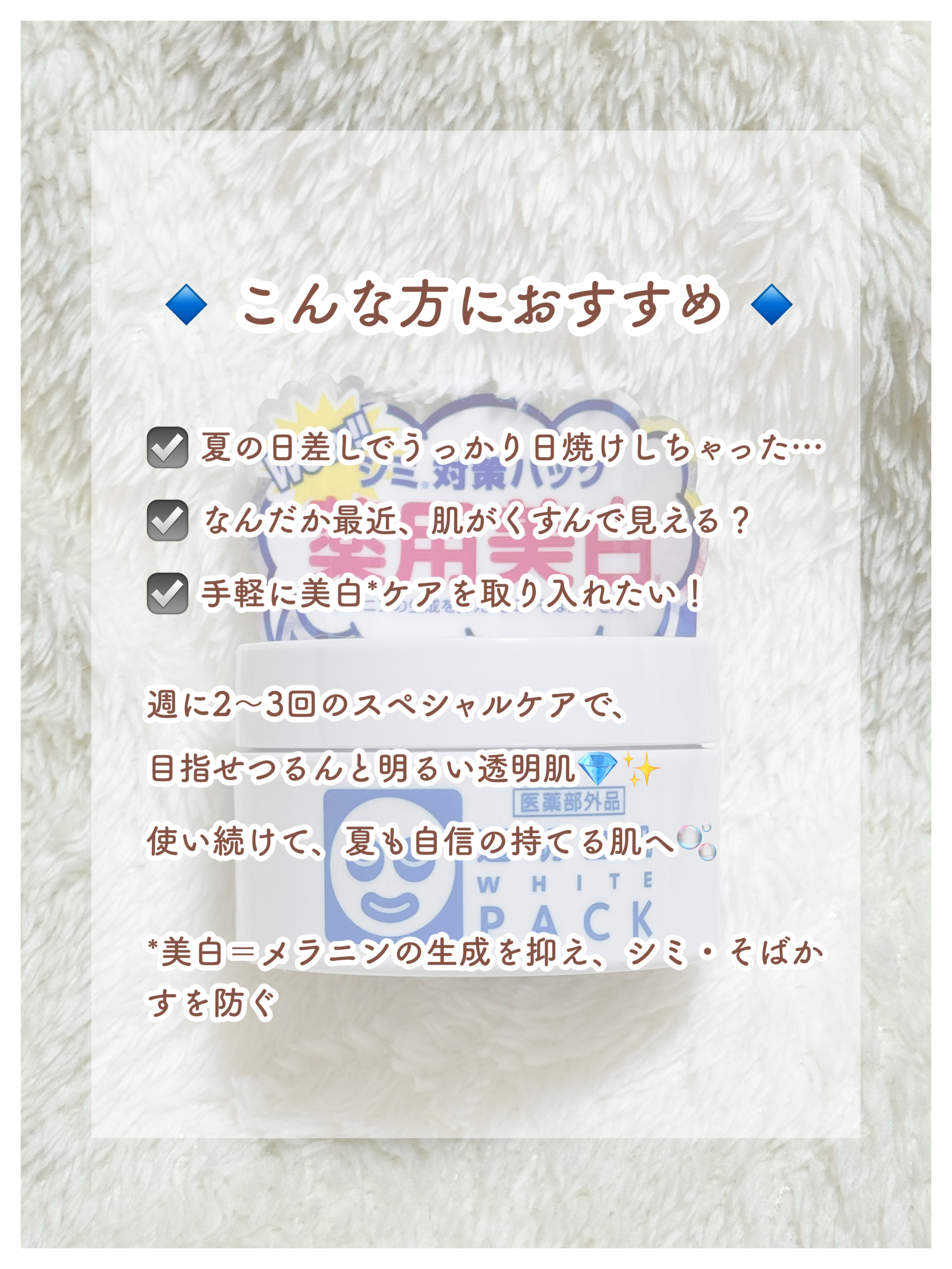 透明白肌 薬用ホワイトパックN トライアルうっかり日焼けに速攻トーンアップ*1できる洗い流すタイプのフェイスパック♡顔はもちろん、首元やデコルテなどボディの美白ケアに使えるよ!もう諦めちゃってた悩みもパッと明るく白肌チェンジ✨️洗顔後のお肌に...