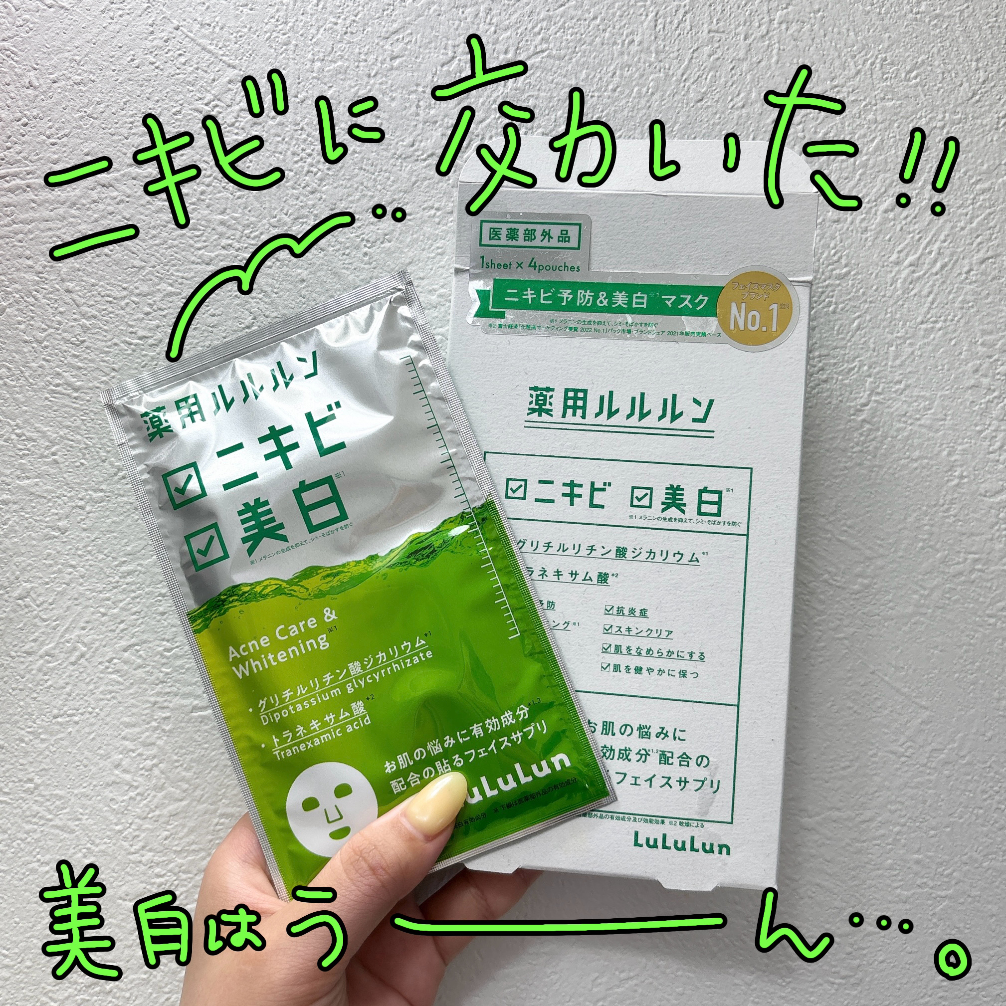 - 【医薬部外品】 ルルルン初の医薬部外品、「薬用ルルルン」が登場。 「薬用ルルルン 美白アクネ」はニキビを予防したい方、美白※1・くすみ※2をケアしたい方におすすめ。 (※1 メラニンの生成を抑えて、シミ・そばかすを防ぐ ※2乾燥による)