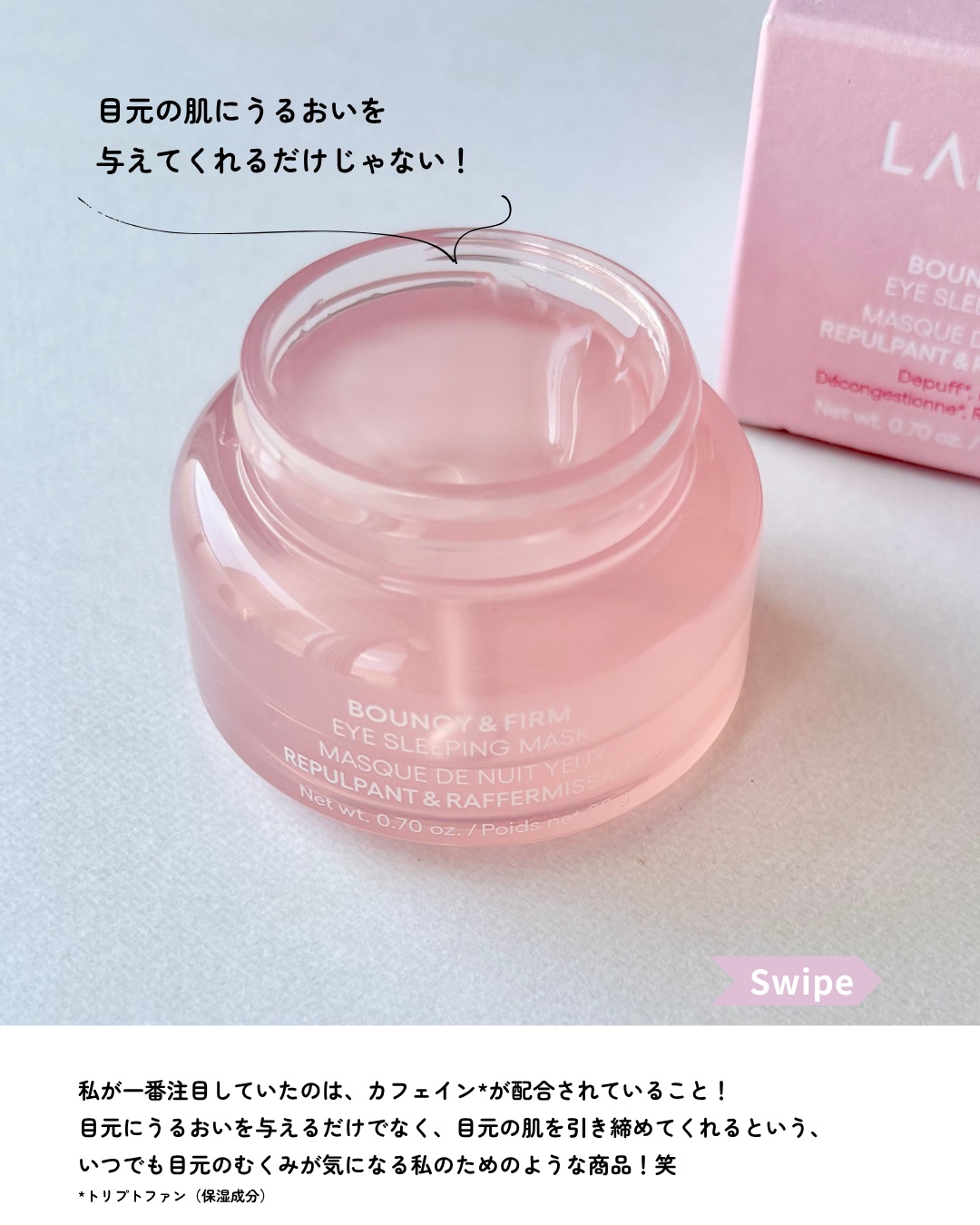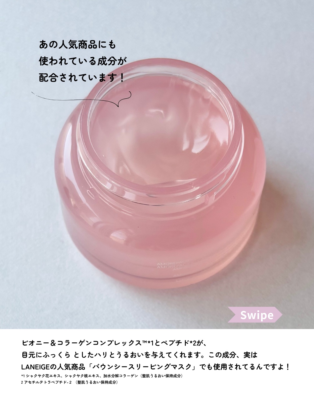 - 睡眠前に使用することで、ゴールデンタイムをうまく活用し、寝ている間に効果 的にケアするアイテムです。翌朝にはふっくらうるおい、すこやかで透明感あふれる目元に導きます。 1.【ハリケア】ハリ感のある目元印象に 「バウンシースリーピングマスク」でも使用されたピオニー&コラーゲンコンプレックス™*³とペプチド*⁴が、目元にふっくら としたハリとうるおいを与えます。乾燥からくる疲れた印象を軽減し、咲き誇る花のように力強く、いきいきとした印象へ と導きます。 2.【ひきしめケア】目元の肌を引き締めて、若々しい印象に カフェイン*⁵とナイアシンアミド*⁶を配合。エイジングサイン*²の現れやすい目元に集中的にアプローチ。まぶたから目 尻、目の下までうるおいを与え、透明感のある目元に。毎晩のケアで目元の肌を引き締め、すこやかで若々しい印 象を保ちます。 3.【うるおいケア】潤い満ちたすこやかな肌に プロバイオティクス*⁷とトリプトファン*⁸が肌のうるおいバリアをサポートし、乾燥による外的刺激から肌を守ります。結 果、保湿力が高まるとともに、肌の状態が整えられ、うるおい満ちたすこやかな目元へ導きます。 4.ひんやりとした軽やかなテクスチャーが、気分まですっきり 目元に塗った瞬間広がる、ひんやりとしたテクスチャーが、デリケートな肌を軽やかに包み込み、うるおいに満ちたすこ やかで透明感あるあふれる目元に導きます。デスクワークで疲れた目元にひんやりジェルをのせるのもおすすめ。 ² 乾燥によるハリや透明感の低下 ³ シャクヤク花エキス、シャクヤク根エキス、加水分解コラーゲン(整肌うるおい保持成分) ⁴ アセチルテトラペプチド-2 (整肌うるおい保持成分)⁵ カフェイン(整肌成分) ⁶ ナイアシンアミド(保湿成分) ⁷乳酸桿菌培養溶解質(保湿成分) *⁸ トリプトファン(保湿成分)