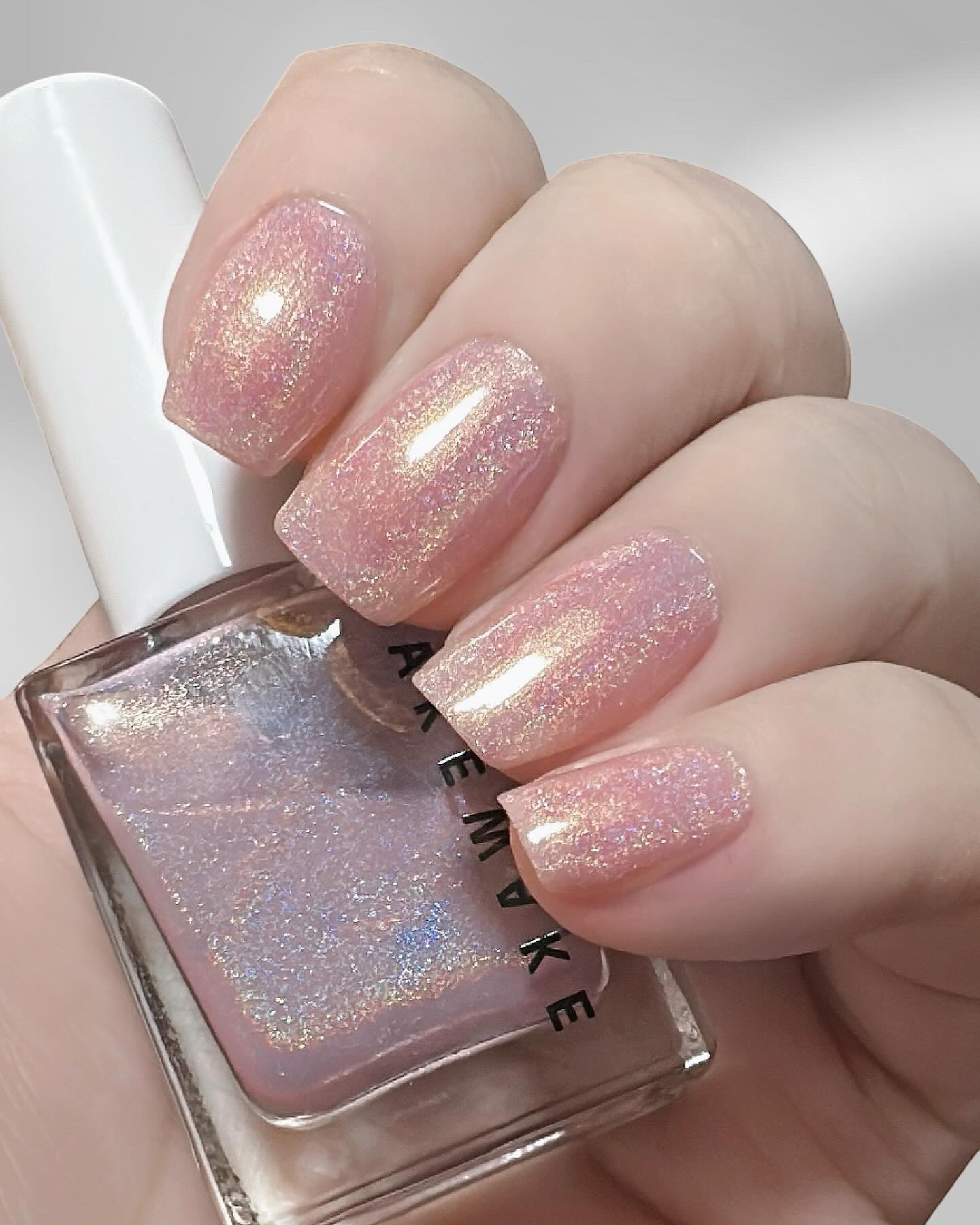 ピンク(紫?)ベースに虹色のラメが輝いて、マジックアワーのようななんとも夢カワな爪になる。 眺めると元気が出るタイプのポリッシュをお探しの方はぜひ。 日本にはあまり無いギラギラなネイルをこの値段で買えるのは嬉しすぎる。