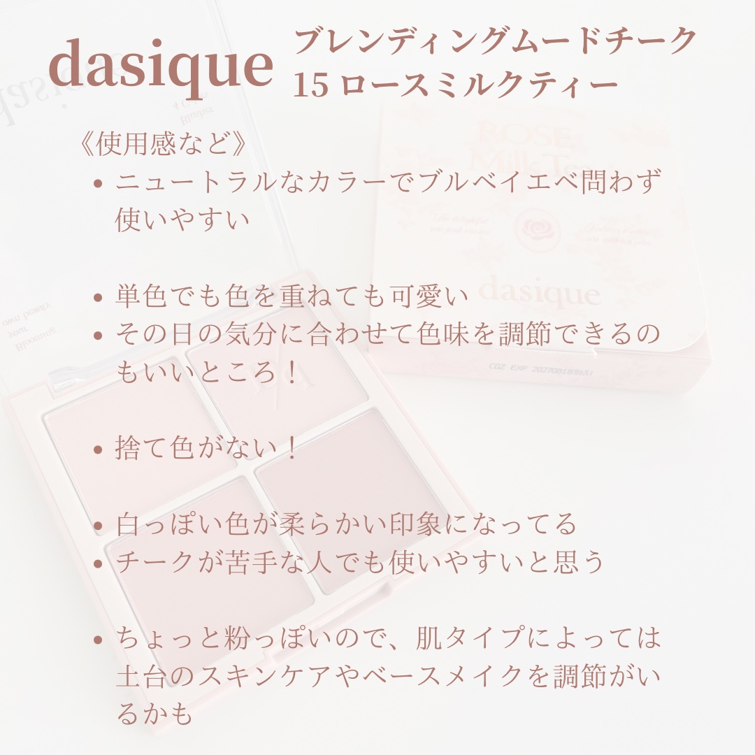 こんにちは。こんばんは。今回はdasiqueのブレンディングムードチークをレビューしたいと思います!【使った商品】dasiqueブレンディングムードチーク15ローズミルクティー【使ってみて】粉質柔らかくて粉飛びはしやすいかなと思います。明るめ...