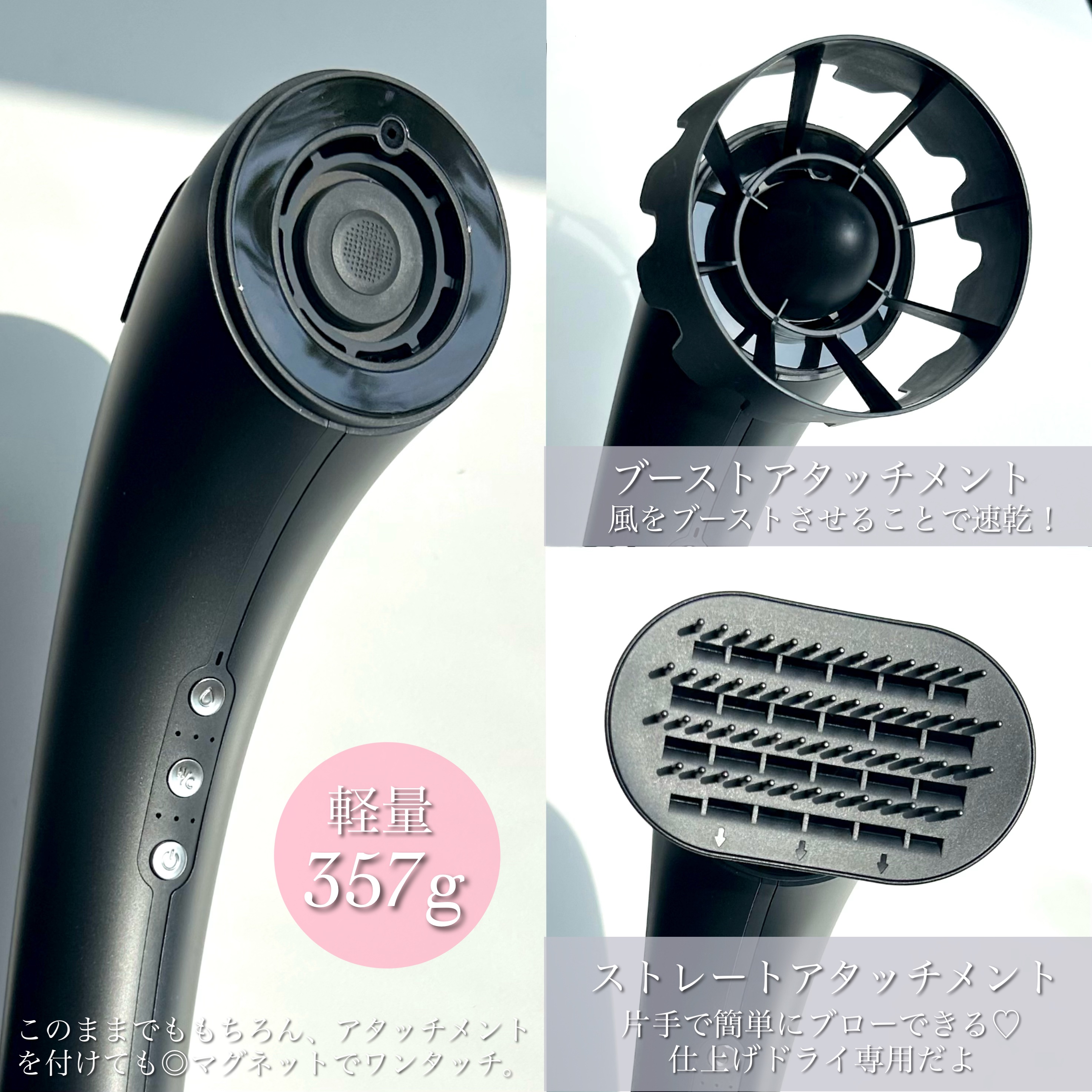 - ■ナノ化されたミストで髪の深部までうるおいケア 粒子サイズを1μm(0.001mm)前後にナノ化した美容液が、ドライヤーからミストとして噴射し髪に浸透します。ミストセラムに配合した髪の補修に優れた美髪成分(ヒアルロン酸*1、浸透型ケラチン*2、浸透型シルク*3等)が、髪の深層部にまでしっかり届くことで、髪本来の潤いを引き出し、毛先までしっとりとまとまりのある理想的な美髪を実現。乾かす時間を美容時間にアップデートします。 *1 ヒアルロン酸ナトリウム(補修) *2 加水分解ケラチン(補修) *3 加水分解シルク(補修) ■軽量なのに大風量でパワフル 約357g*1と軽量なボディでありながら、風量は驚くほどパワフル。超高速モーターと、飛行機のジェットエンジン機能を活かしたBrighte独自の技術で風路設計を最適化。2.58㎥/分*2という大風量で圧倒的な速乾を実現しました。 *1本体のみ *2自社測定、ブーストアタッチメント装着、3段風量(強)時 ■美髪テクノロジー搭載 ・すぐれた熱伝導性と電気伝導性を兼ね備えた「グラフェン」の遠赤外線 ヘッド部分の中央に、すぐれた熱伝導性と電気伝導性を兼ね備えた素材「グラフェン」を採用。 表面だけ乾燥した髪はうねりの原因に。 グラフェンが放出する遠赤外線により熱分散がより均一になり、髪の内側からやさしく乾かします。 生乾きすることなく乾かしすぎを防ぎ、最適な水分バランスを実現します。 ・デュアルイオンテクノロジー効果 プラスとマイナス両イオンを備えたBrighte 独自のデュアルイオンテクノロジーの相乗効果で、髪の毛一本一本をケア。 プラスイオンで髪の表面を整えながら、マイナスイオンで静電気を抑え髪のまとまりを向上させます。 ・頭皮にうれしいLEDテクノロジー 吹出口周辺には、エイジングケア*する赤色LEDと、頭皮のベタつきを抑え整肌する青色LEDを搭載し、髪だけでなく頭皮環境にもアプローチします。 *年齢に応じたケア