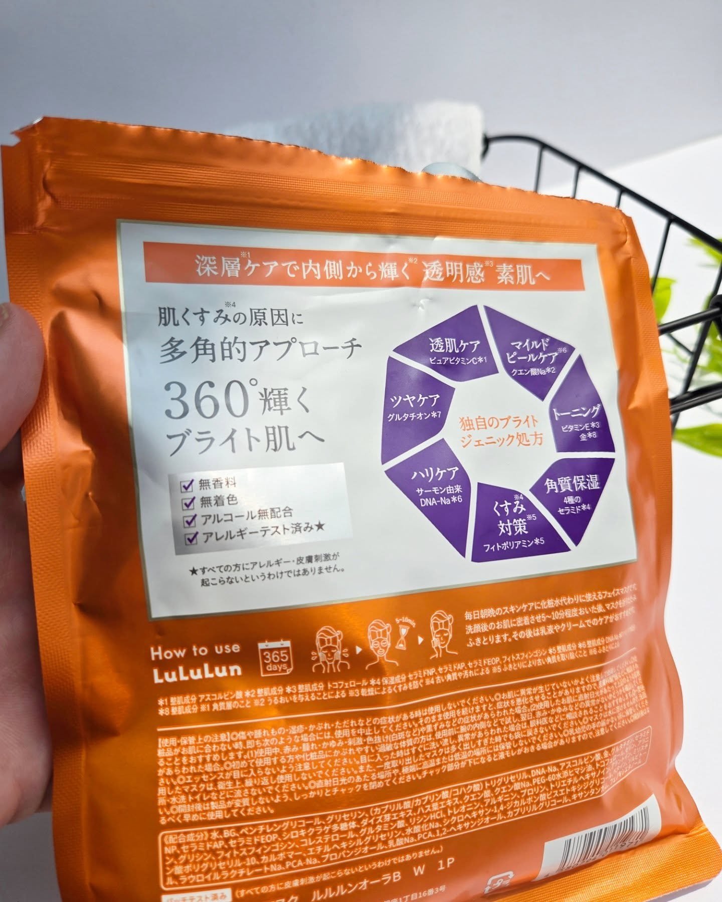 - <ルルルン オーラブライトマスク W 28枚入> 水、BG、ペンチレングリコール、グリセリン、(カプリル酸/カプリン酸/コハク酸)トリグリセリル、DNA-Na、アスコルビン酸、金、グルタチオン、セラミドNP、セラミドAP、セラミドEOP、シロキクラゲ多糖体、ダイズ芽エキス、ハス葉エキス、クエン酸、クエン酸Na、PEG-60水添ヒマシ油、トコフェロール、セリン、アラニン、グリシン、フィトスフィンゴシン、コレステロール、グルタミン酸、リシンHCl、トレオニン、アルギニン、プロリン、トリエチルヘキサノイン、アラントイン、ミリスチン酸ポリグリセリル-10、カルボマー、エチルヘキシルグリセリン、水酸化Na、シクロヘキサン-1,4-ジカルボン酸ビスエトキシジグリコール、ベタイン、ソルビトール、ラウロイルラクチレートNa、PCA-Na、プロパンジオール、乳酸Na、PCA、1,2-ヘキサンジオール、カプリリルグリコール、キサンタンガム、フェノキシエタノール <ルルルン オーラブライトマスク W 7枚入> 水、BG、ペンチレングリコール、グリセリン、(カプリル酸/カプリン酸/コハク酸)トリグリセリル、DNA-Na、アスコルビン酸、金、グルタチオン、セラミドNP、セラミドAP、セラミドEOP、シロキクラゲ多糖体、ダイズ芽エキス、ハス葉エキス、クエン酸、クエン酸Na、PEG-60水添ヒマシ油、トコフェロール、セリン、アラニン、グリシン、フィトスフィンゴシン、コレステロール、グルタミン酸、リシンHCl、トレオニン、アルギニン、プロリン、トリエチルヘキサノイン、アラントイン、ミリスチン酸ポリグリセリル-10、カルボマー、エチルヘキシルグリセリン、水酸化Na、シクロヘキサン-1,4-ジカルボン酸ビスエトキシジグリコール、ベタイン、ソルビトール、ラウロイルラクチレートNa、PCA-Na、プロパンジオール、乳酸Na、PCA、1,2-ヘキサンジオール、カプリリルグリコール、キサンタンガム、フェノキシエタノール