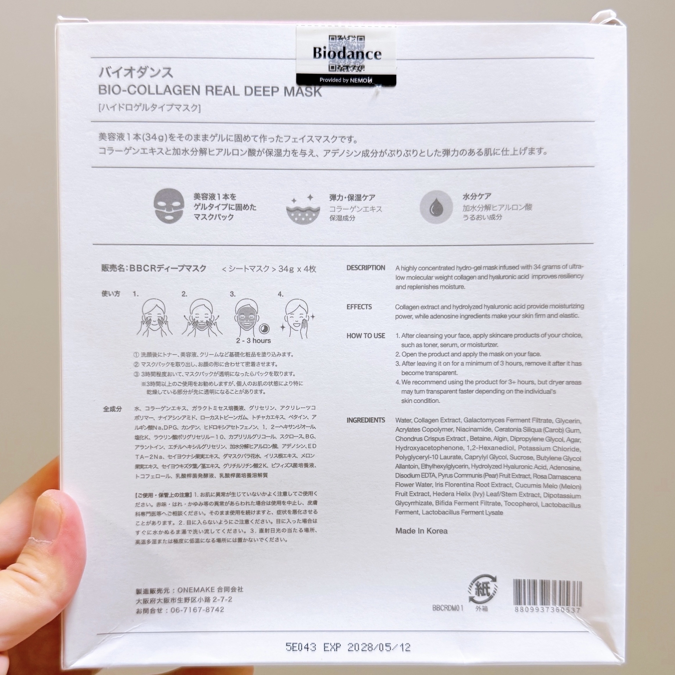 Biodanceバイオコラーゲンリアルディープマスク弾力のあるぷるぷるのハイドロゲルマスク。重厚感がありますが不思議とぴったりと密着感があります。推奨使用時間が3時間らしいのですが、貼っている間はひんやりとして気持ちがいい◎7月8日~14日の...