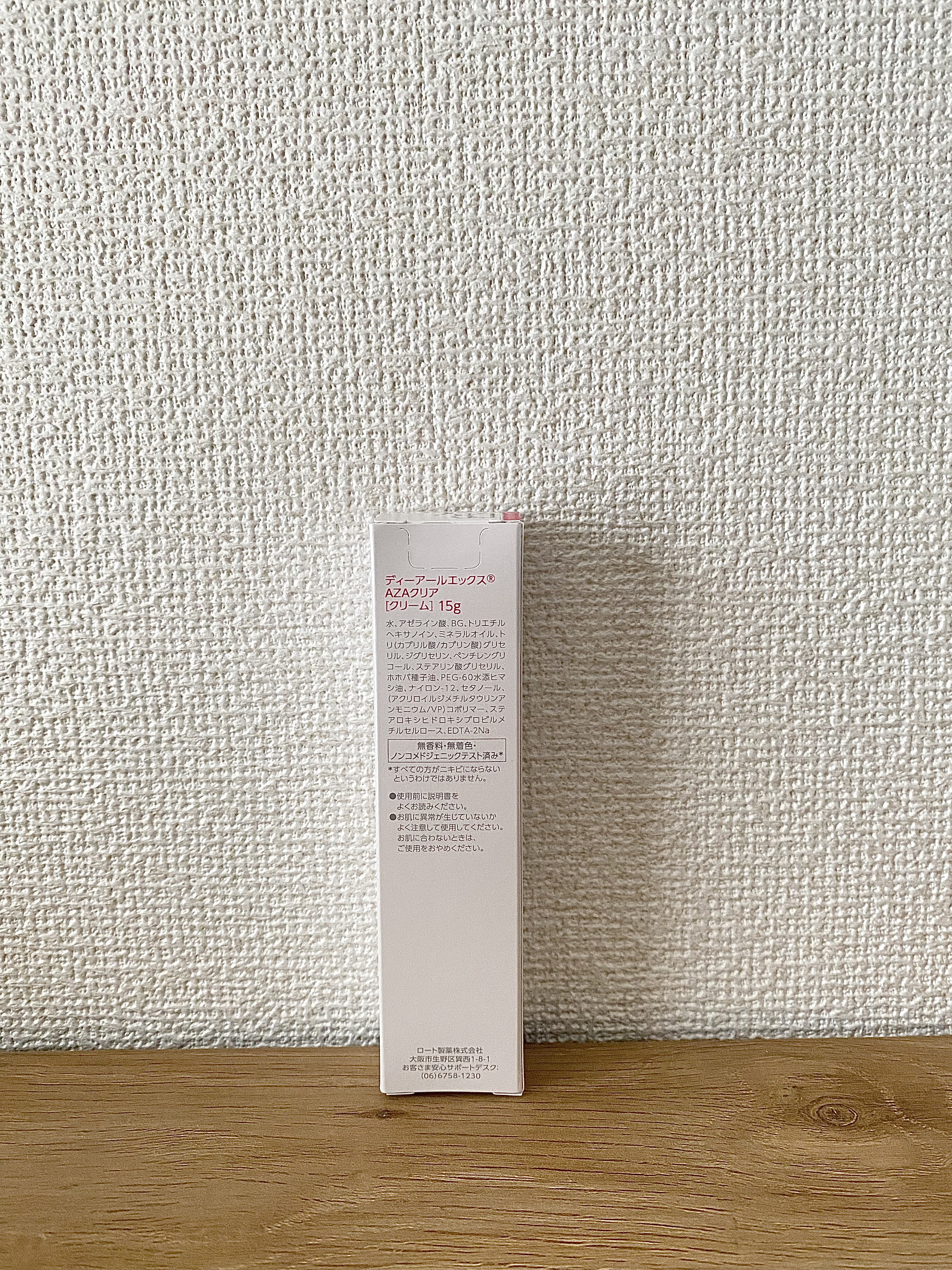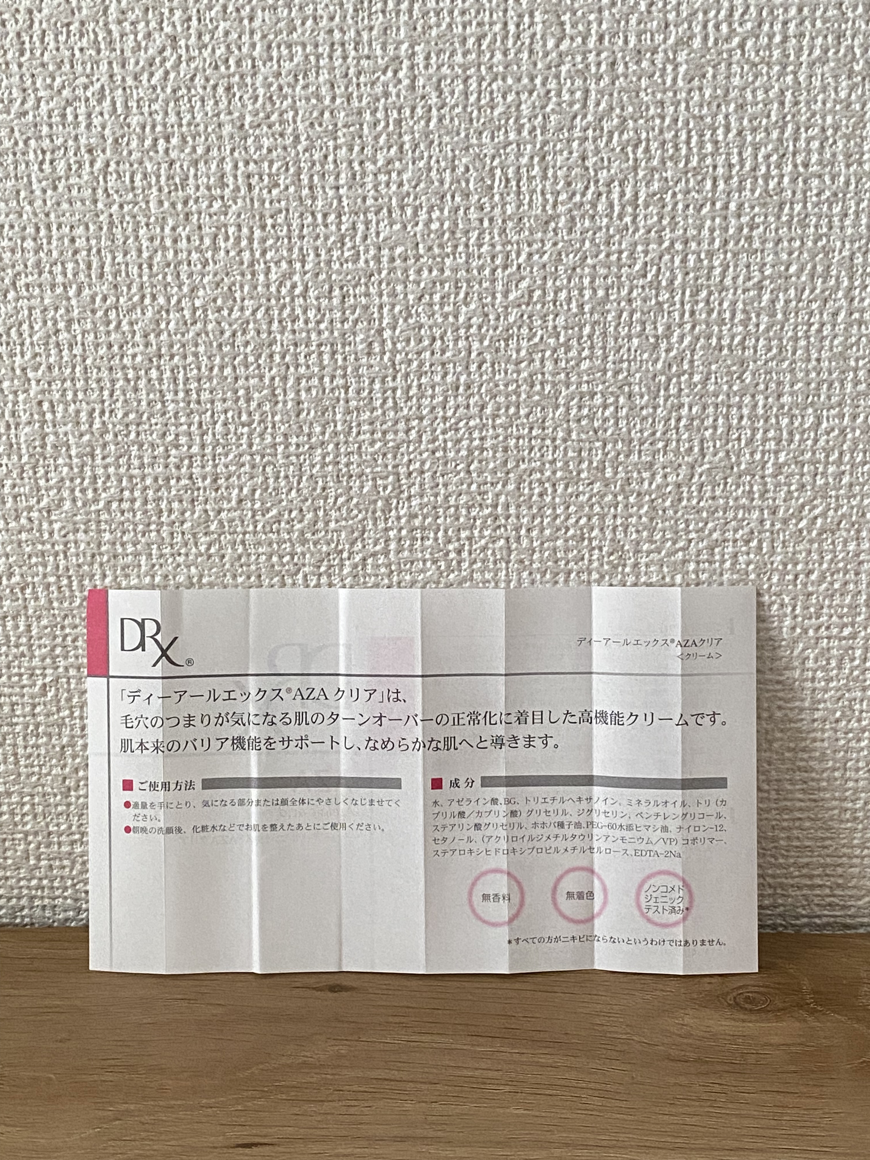 - <DRX AZAクリア> 水、BG、ジグリセリン、ホホバ種子油、トリエチルヘキサノイン、セタノール、ミネラルオイル、ステアリン酸グリセリル、PEG-60水添ヒマシ油、アゼライン酸、EDTA-2Na、(アクリロイルジメチルタウリンアンモニウム/VP)コポリマー、トリ(カプリル酸/カプリン酸)グリセリル、ナイロン-12、ステアロキシヒドロキシプロピルメチルセルロース、ベンチレングリコール