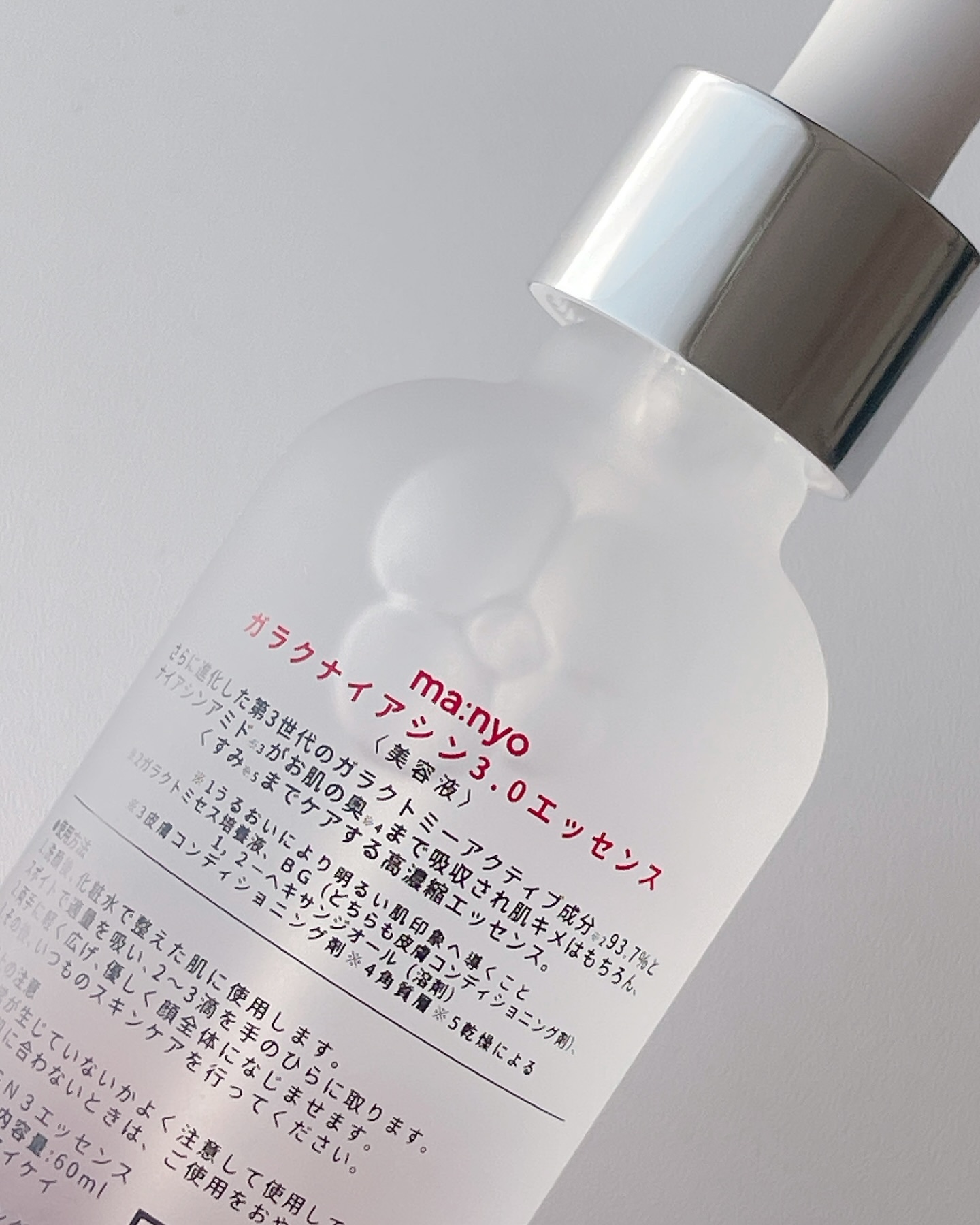 - ・manyoの独自成分!3倍*¹高濃縮でより強力な3世代ガラク 電気石を発酵器に添加し、微生物の成長に刺激を与えガラクトミセス菌の活性度増加!生長性の高いガラクトミセス菌株からガラクトミセス培養液*²を抽出し、肌のキメケアとともに透明感*³のあるお肌へ *¹ 3倍は高濃縮工程前、初期のガラクトミセス培養液(皮膚コンディショニング剤)と比較した場合 *² 皮膚コンディショニング剤 *³ キメが整った肌が与える印象のこと ・肌トーンケア*⁴、毛穴ケア*⁵、肌キメケア*⁶まで、保湿効果 3世代ガラク(Galactomy Active™ 7)と、ナイアシンアミド²配合で保湿成分をより強化し、くすんだ肌トーン*⁸から肌キメ、毛穴*⁵までケアします。 *⁴ 保湿により肌にツヤを与え明るい印象に見せること *⁵ 保湿することで肌をなめらかに整えツヤを与えることで毛穴を目立たなくすること *⁶ キメが整った素肌へ導くお手入れのこと *⁷ ガラクトミセス培養液、BG(どちらも皮膚コンディショニング剤)、1,2-ヘキサンジオール(溶剤) *⁸ 乾燥による ・水のようなさらっとしたテクスチャーで、べたつかず角質層まですっと浸透 保湿成分配合のウォータリーテクスチャーで、使用感は既存の「ガラク ナイアシン 2.0 エッセンス」と同じくさらっとした水のようなテクスチャー。角質層まで素早く浸透!べたつかない使用感で使いやすくて、角質層の奥まで潤い、表面はなめらかで整った肌へ 3月17日(月)からオフラインのバラエティショップで販売 3月24日(月)よりQoo10公式、楽天公式ショップで販売